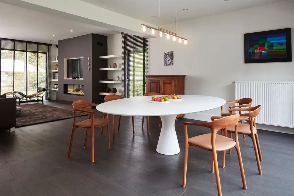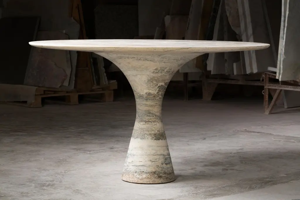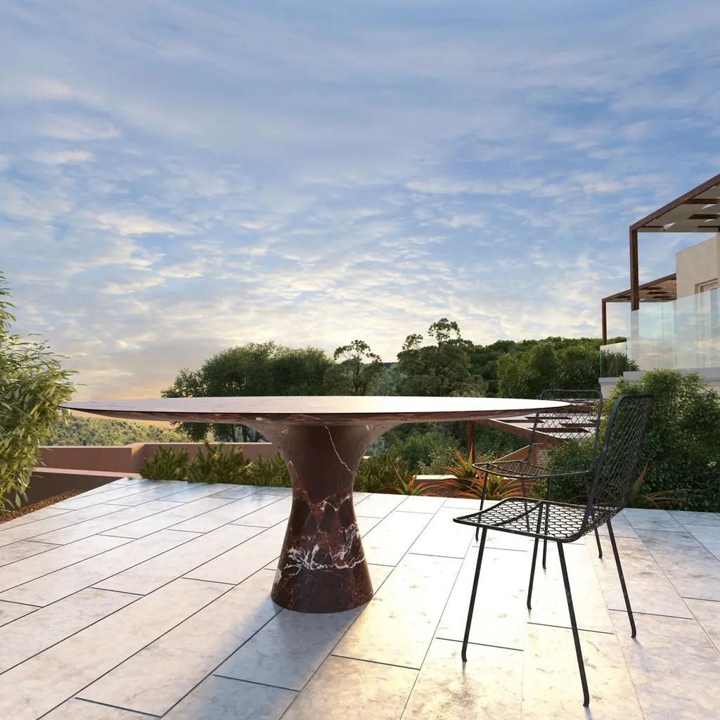 Picasso Green refined contemporary marble dining table 250/75Dimensions: 250 x 160 x 75 cmMaterials: Picasso Green marble.Angelo is the essence of a round table in natural stone, a sculptural shape in robust material with elegant lines and refined finishes.The collection consists of a round/oval dining or conference table, side tables and lower tables.Suitable for both indoor and outdoor use!All tables are made by order and finished by hand to be sure that the tabletop and base become one pieceThe basic collection consists of 9 different marbles and different standard dimensions, however on request we make to measure.Almost any size or marble is possible!All tables are signed and numbered (the low and side tables are only signed).All tables are impregnated with Lithofin Nanotop. This protection is not visible and the marble keeps its natural look and feel. With the delivery of every table, a maintenance set of Lithofin is included.The production time is standard 12 weeks.The design Angelo is the essence of a round or oval table in natural stone, it features a sculptural form, sturdy material, an elegant line and a refined finish. Two elements, table base and top, form one whole together. The bottom is one running curve from table foot to edge. The conical connection creates a stabile whole.To show the marble in it’s most expressive character, different finishes are possible (polished, honed, brushed, striped, sandblasted & brushed). The basic collection consists of nine different types of marble and different sizes. On request this design can be executed in almost any type of marble and on measure. This table is perfectly suitable in a housing, retail or office environment. As the table is supported by one central foot it creates a lot of flexibility in seating. Executed in hard variations of natural stone suited for external use, this design can be a perfect garden table or sculpture.Angelo M/R 130 : ø 130 x 75 cmAngelo M/R 160 : ø 160 x 75 cmAngelo M/R 180 : ø 180 x 75 cmAngelo M/O 210 : 210 x 135 x 75 cmAngelo M/O 250 : 250 x 160 x 75 cmAngelo M/O 290 : 290 x 160 x 75 cm The basic collection is available in the following marbles: Kyknos, Grafite, Travertino Rosso, grey saint Laurent, Picasso green, port saint Laurent, Travertino silver, Rosso Lepanto and Bianco Statuarietto in a honed finish. On request different sizes, finishes and marbles are possible. AwardsGood Design Award – Chicago, USA (2018)People’s Choice, AZ Award – Toronto, Canada (2019)German Design Award – Frankfurt, Germany (2020).
