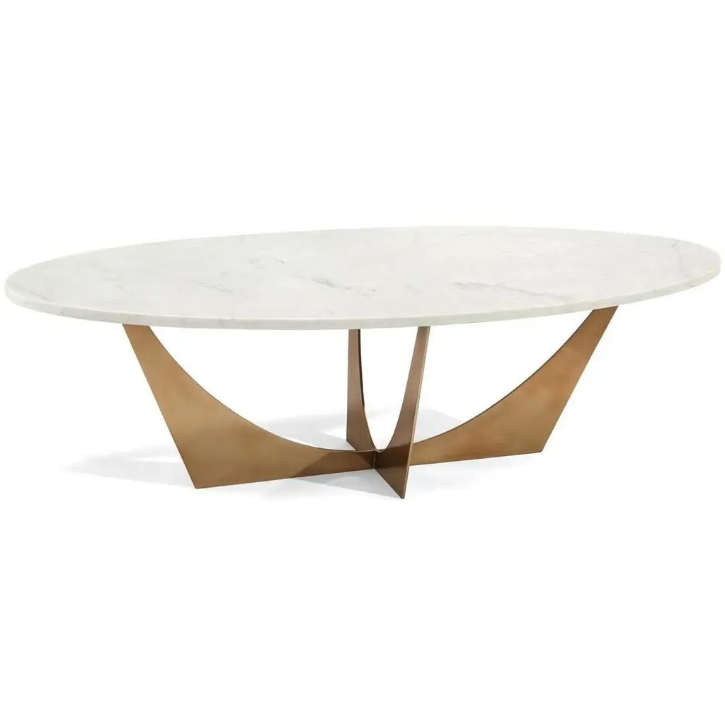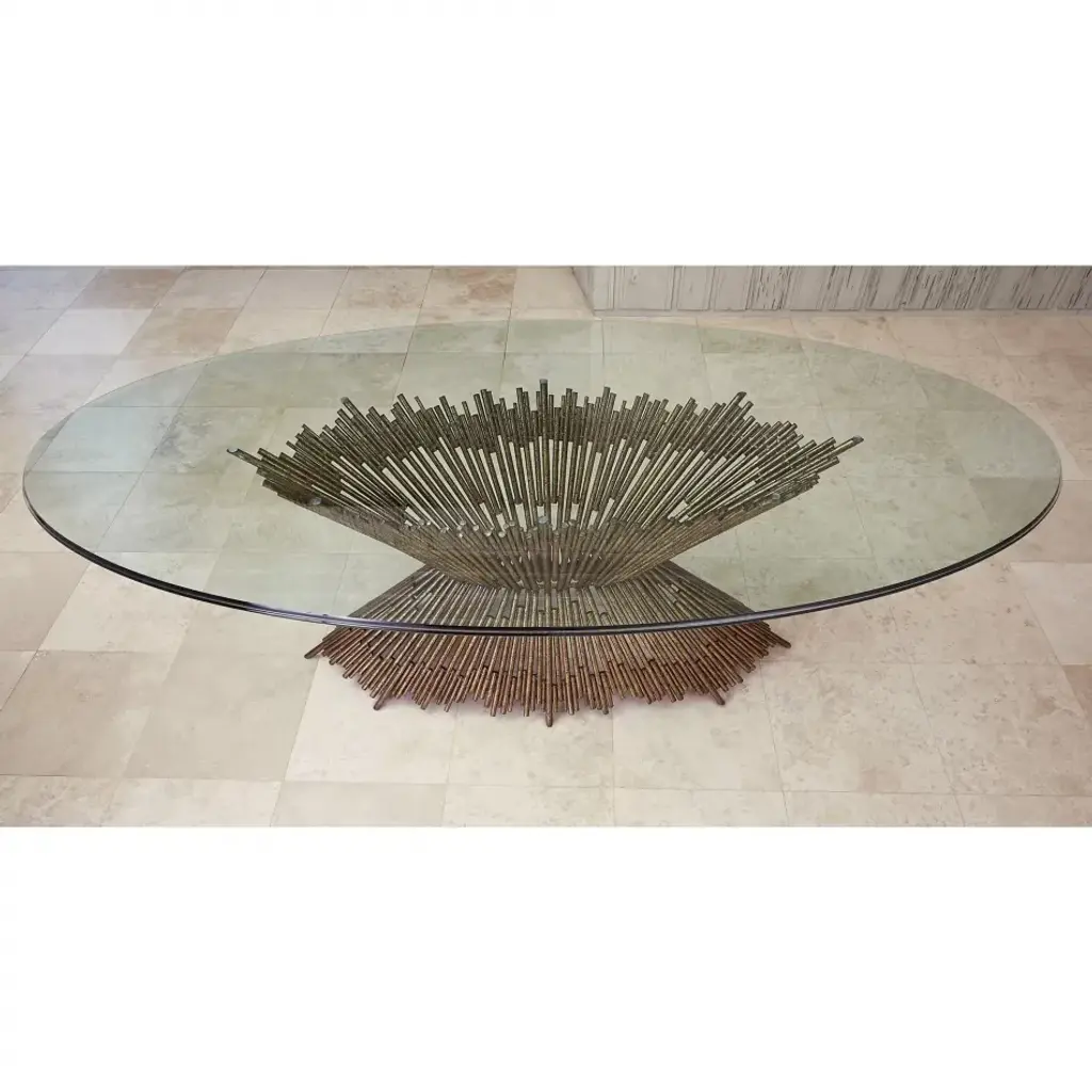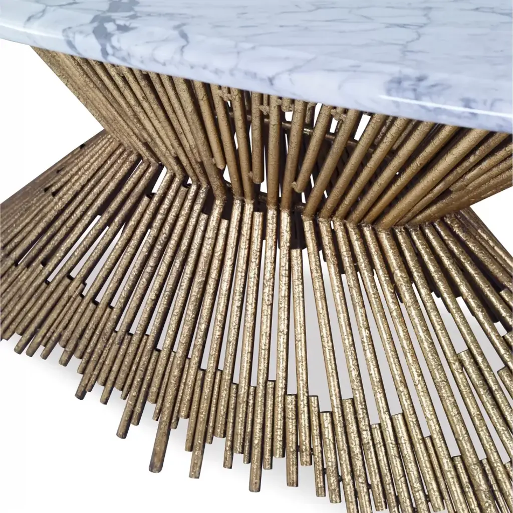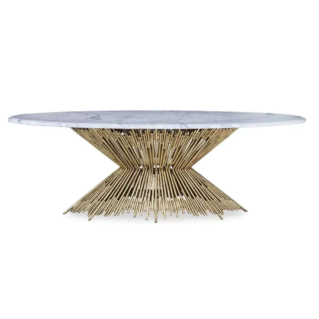 Made of iron and finished in gold leaf. Sturdy table base will hold stone, glass or wood top in sizes as large as 48'' x 96''. Oval marble top available through Ambella Home.