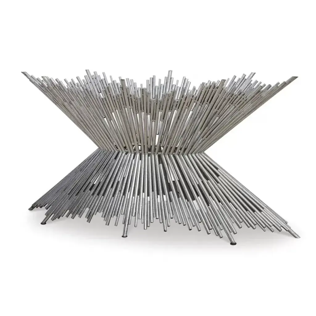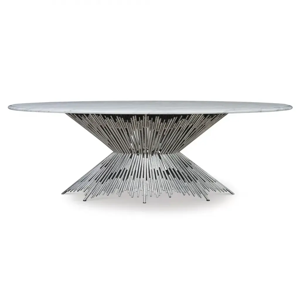 Crafted from iron tubes with a silver metal leaf finish, this statement oval dining table is available with two top options; Statuario marble or 5/8" thick clear glass. Both sold separately.