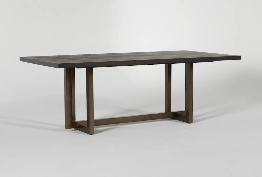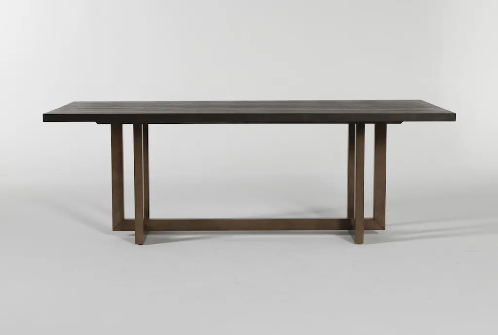 Bringing new meaning to clean living, our Pierce Espresso dining table lends airy, streamlined style to every meal. A sleek, minimalist profile distinguishes the design, which features sturdy hardwood and oak construction in a rich umber finish. It dazzles with a strikingly architectural base that is painted bronze for a metal look.