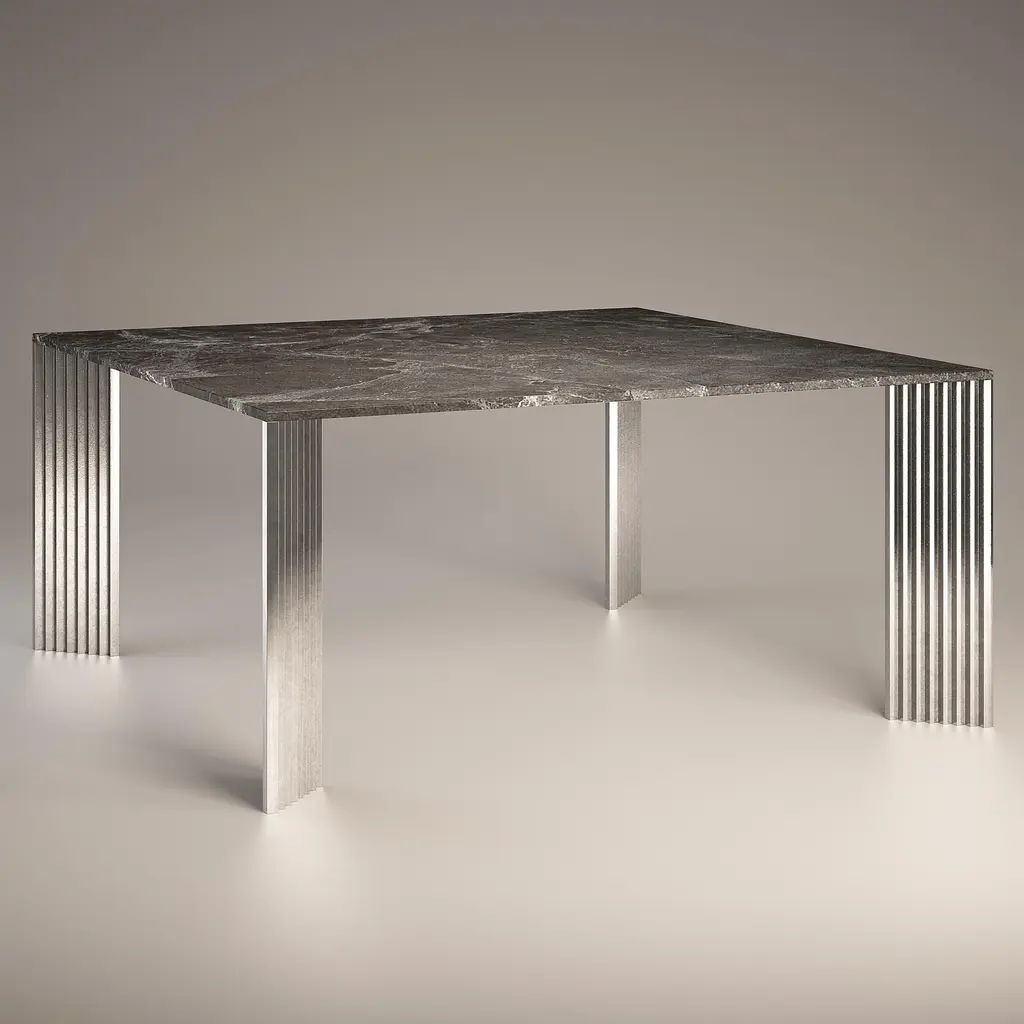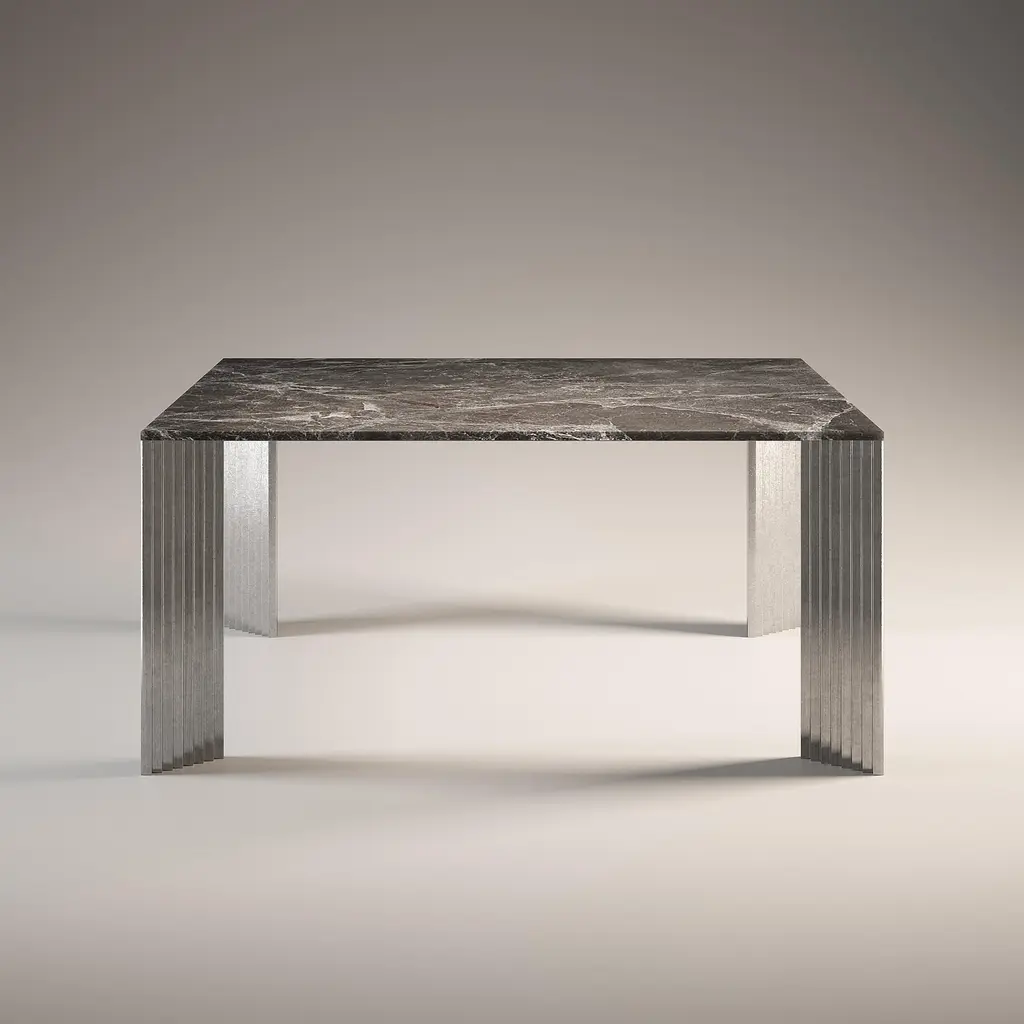 The cast aluminum legs, with their stepped profiles and diagonal position, appear differently from each viewing angle: sometimes slender, then massive, but also polished and at other times rough. The top is in Emperador Grey, a marble that is quarried in Turkey. It presents with a grey background accented with darker gray patches and white smokey motions that give the stone a sophisticated look. Signed by Maker