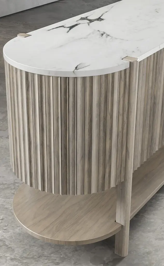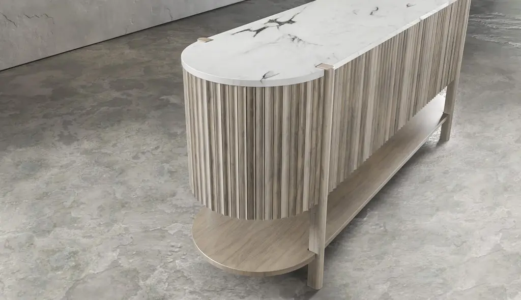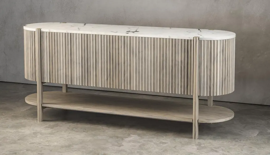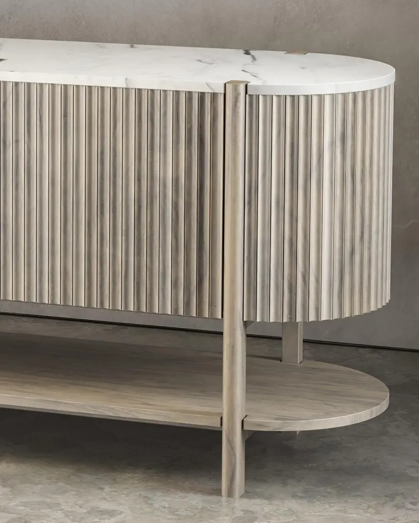 Pilar credenza by INDO-One of a kindDimensions: D 182.9, W 45.7, H76.2 cm Materials: Oxidized Maple, White Carrara Marble topDifferent dimensions available. Also available in other materials (Oak/Maple; Hardwood or Stone top) and finishes (solid or ombre). Each piece is carefully handcrafted by our team using natural materials and traditional processes. Slight variations may occur. The Pilar Dining Table exudes a sense of subtle elegance and character in the space it inhabits. With a solid wood top and fluted double pedestal base, the table is plenty sturdy without looking heavy. The table seats 8 people comfortably and has enough extra room on the ends to fit 2 more in for larger gatherings.INDO- is an award winning interdisciplinary design studio based in Providence, RI. Founded in 2018 by Urvi Sharma and Manan Narang - both grew up in New Delhi and met at the Rhode Island School of Design - INDO- is a product of experiencing both places and cultures. Using a blend of craft and narrative in our creative process, we aim to share the rich cultural and historical identity we bring with us as Indian designers in the rapidly changing landscape of American design. With a focus on re-contextualizing traditional techniques from different disciplines of art and craft into our work, INDO- creates contemporary objects that celebrate the handmade and acknowledge the people and places that inspired them.