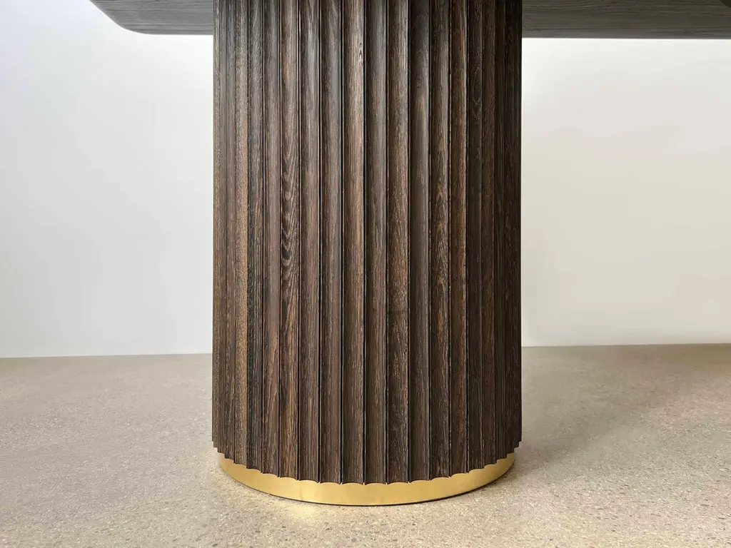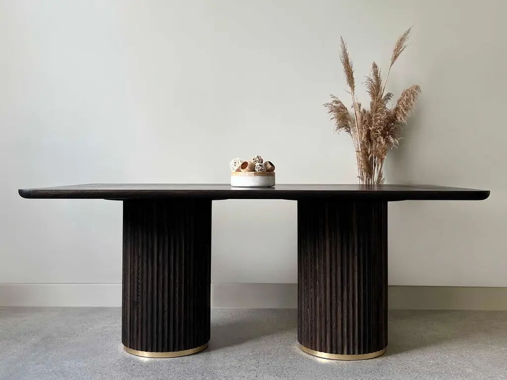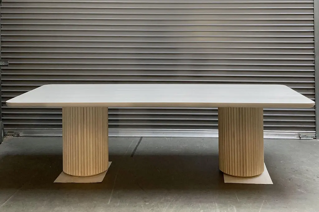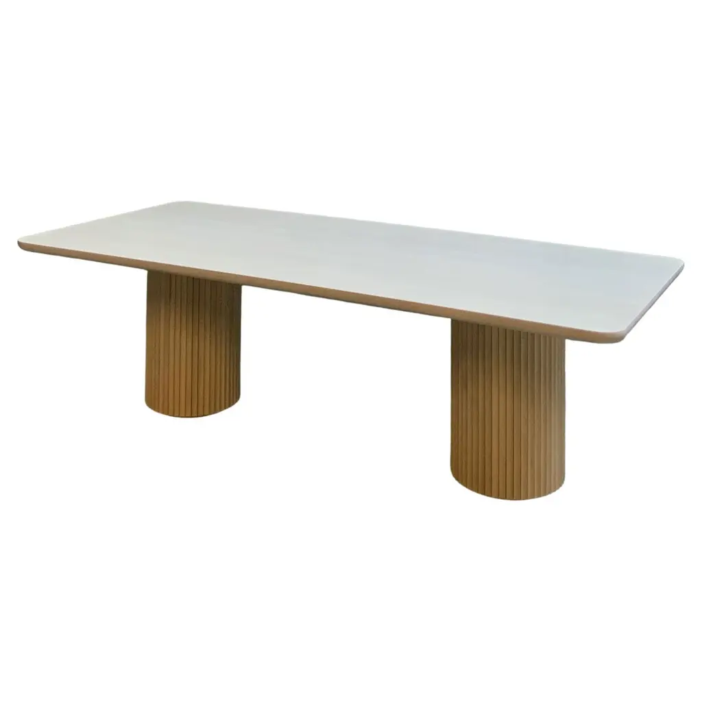 The Pilar Dining Table exudes a sense of subtle elegance and character in the space it inhabits. With a solid wood top and fluted double pedestal base, the table is plenty sturdy without looking heavy. The table seats eight and has enough extra room to add two more for larger gatherings.Apart from the standard colors, they can be made in a range of customized colors and stone tops. Inspired by our travels to Barcelona, the intense, bold use of color by Gaudi in his architectural mosaics alongside the rich, earthy glazes of Catalan ceramics, we aim to create the same feeling of warmth and wonder through the pieces in the Pilar Collection. From afar, the layered hues mimic a mosaic, with each tile of color representing a piece of the complete picture. Recontextualizing the process of dipping and layering glazes on ceramics alongside the tactility of its fluted wooden surface, the Pilar Collection invites you to come closer, discovering moments of color and intensity particular to each flute as they create a constant dialogue of light and shadow. The Pilar Collection is a nod to simple, functional, contemporary design with a beauty inherent in the handmade.