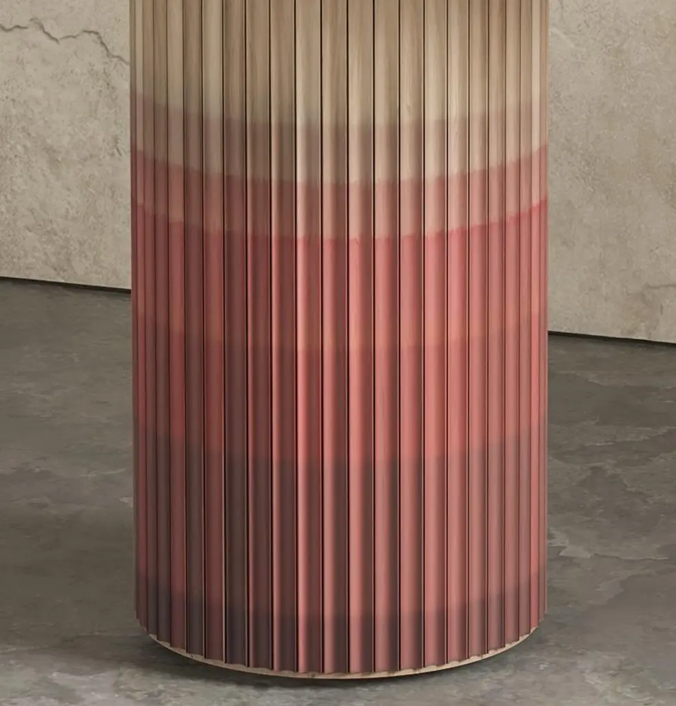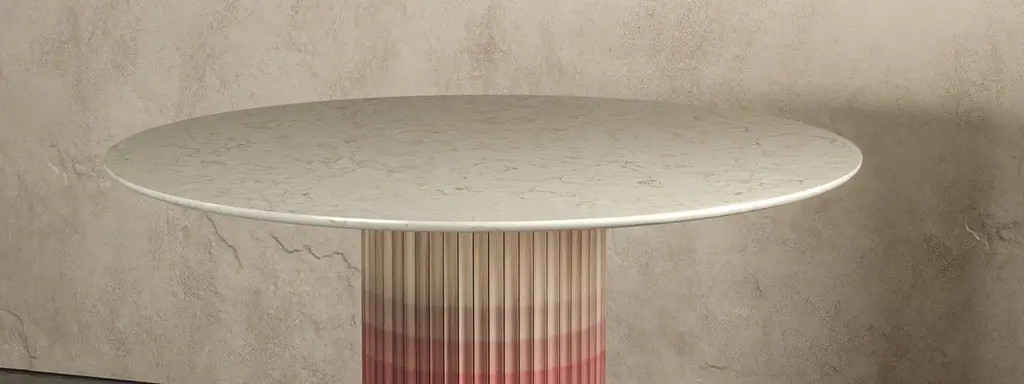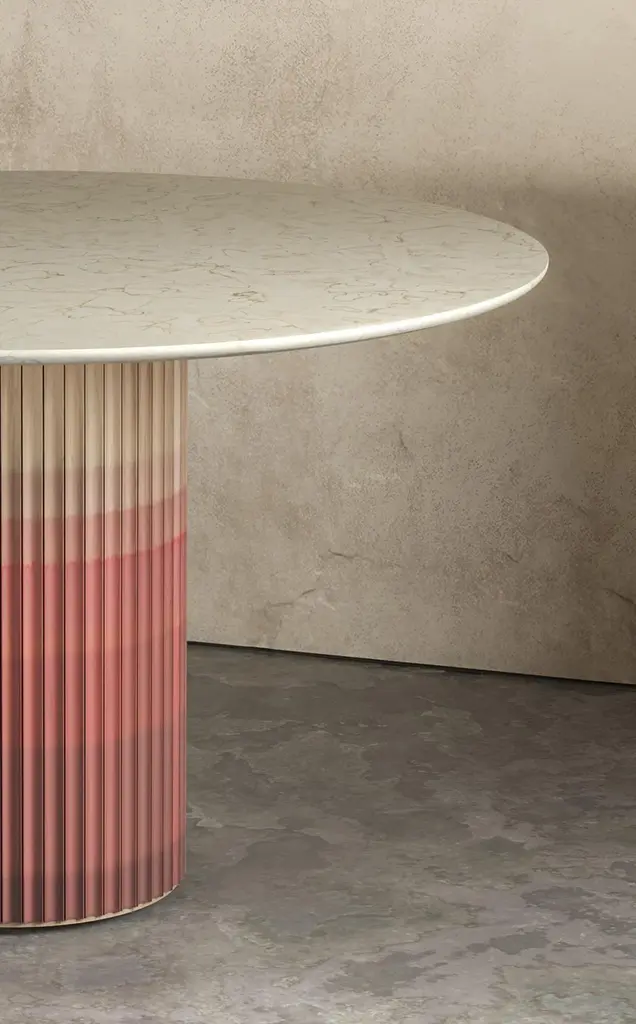 Pilar round dining table by INDO-One of a kind.Dimensions: Ø122 x 76.2 cm Materials: Maple with copper red ombre finish, White Carrara marble top.Also available in other materials and finishes.Each piece is carefully handcrafted by our team using natural materials and traditional processes. Slight variations may occur. INDO- is an award winning interdisciplinary design studio based in Providence, RI. Founded in 2018 by Urvi Sharma and Manan Narang - both grew up in New Delhi and met at the Rhode Island School of Design - INDO- is a product of experiencing both places and cultures. Using a blend of craft and narrative in our creative process, we aim to share the rich cultural and historical identity we bring with us as Indian designers in the rapidly changing landscape of American design. With a focus on re-contextualizing traditional techniques from different disciplines of art and craft into our work, INDO- creates contemporary objects that celebrate the handmade and acknowledge the people and places that inspired them.