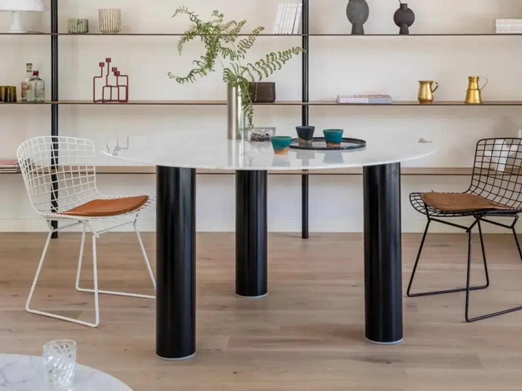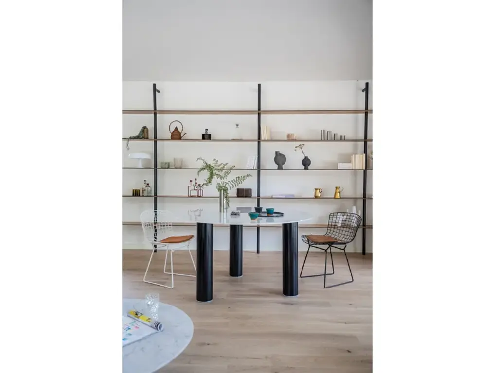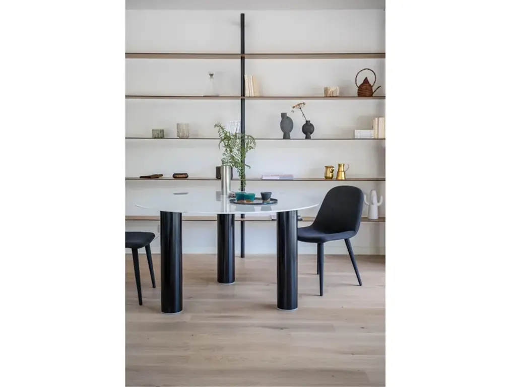 Pilotis Claouey is a dining table from the Pilotis collection which is made up of tables in basic shapes with cylindrical legs. They are designed by Emmanuel Gallina and are reminiscent of dwellings built on stilts. In the marble version, the carbon finish has a leather look that balances out the “minerality” of the top. The legs, finished with metallic or marble end pieces, add a final, elegant detail. The first BELULL collection, designed by Emmanuel Gallina , combines elegance, timelessness and simplicity. Inspired by the Médoc landscape, this range uses carbon combined with other noble materials to create modern and unique furniture.