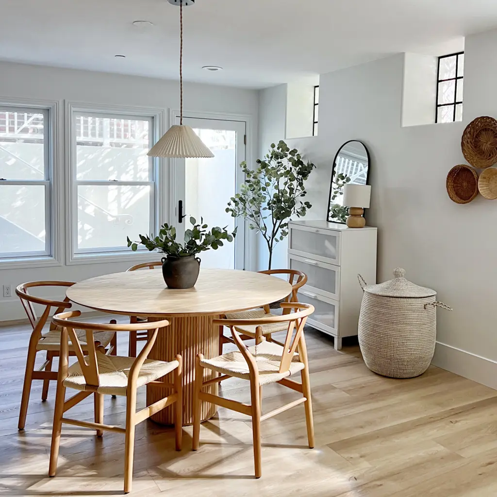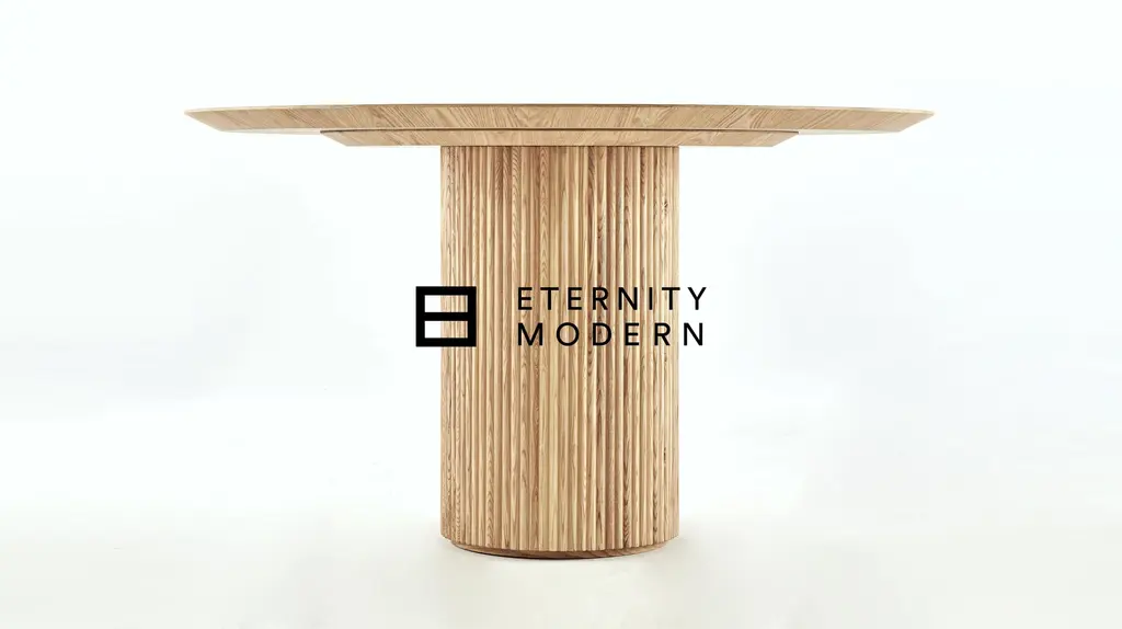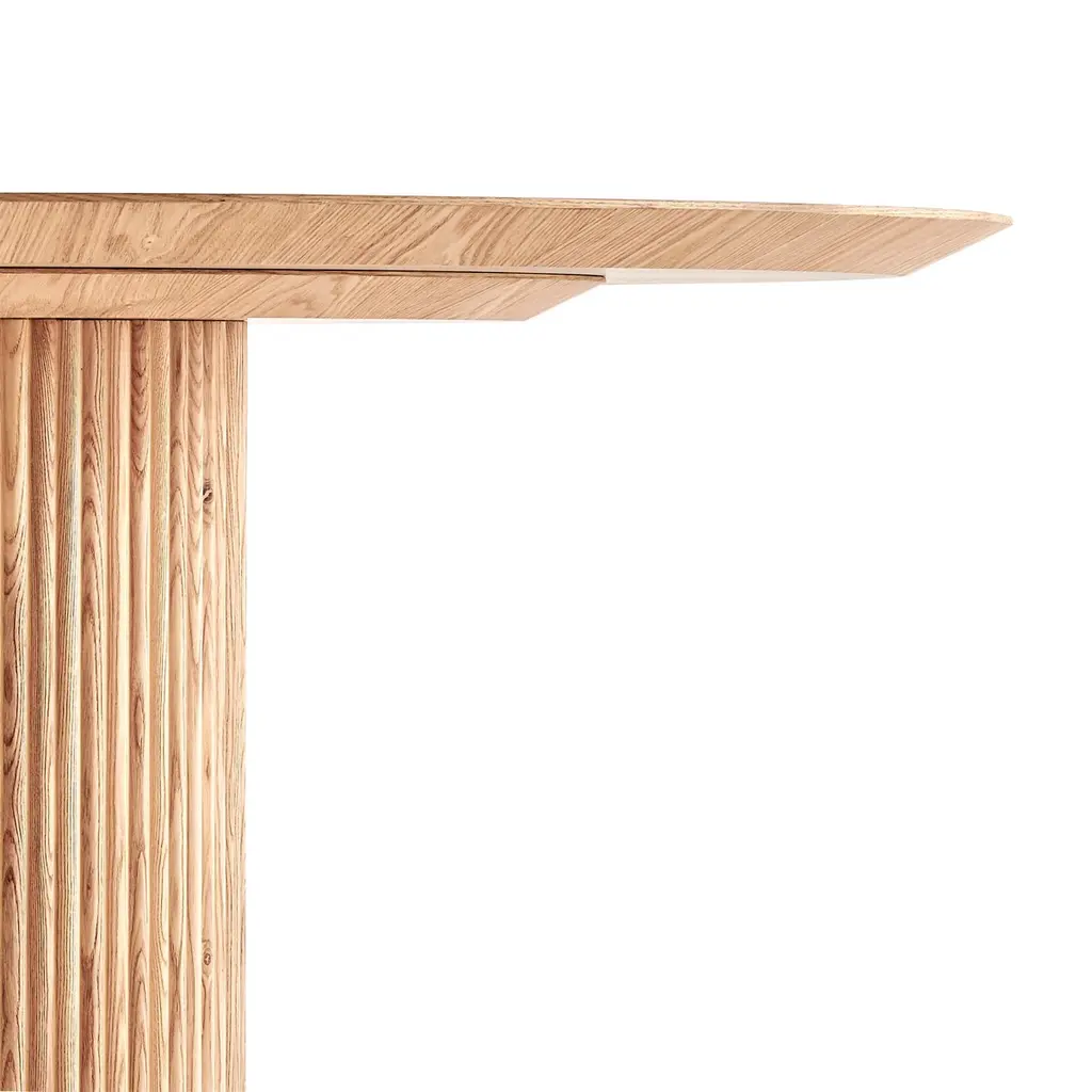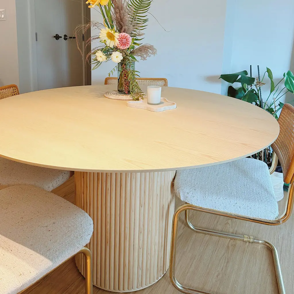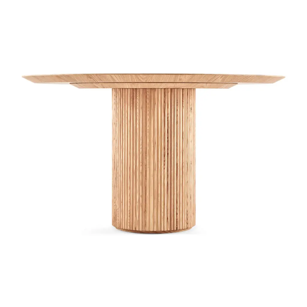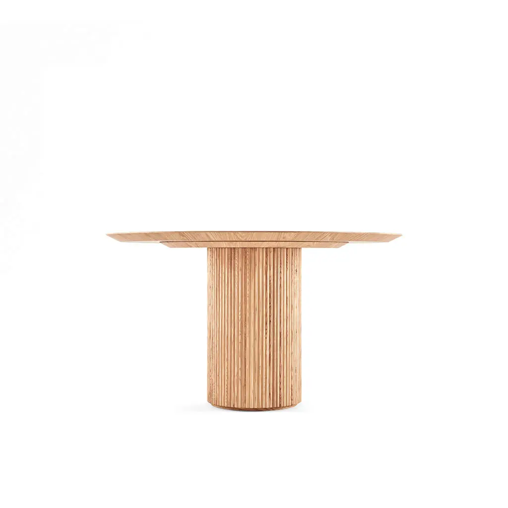 The Piper Natural Wood Round Dining Table seamlessly combines curved surfaces and subtle linear patterns to evoke a light and airy feel. Its ash wood top adds an organic touch, and its round, fluted base with a pillar design offers charming visual interest. Together, they form a soft, rounded silhouette that radiates warmth and beauty.