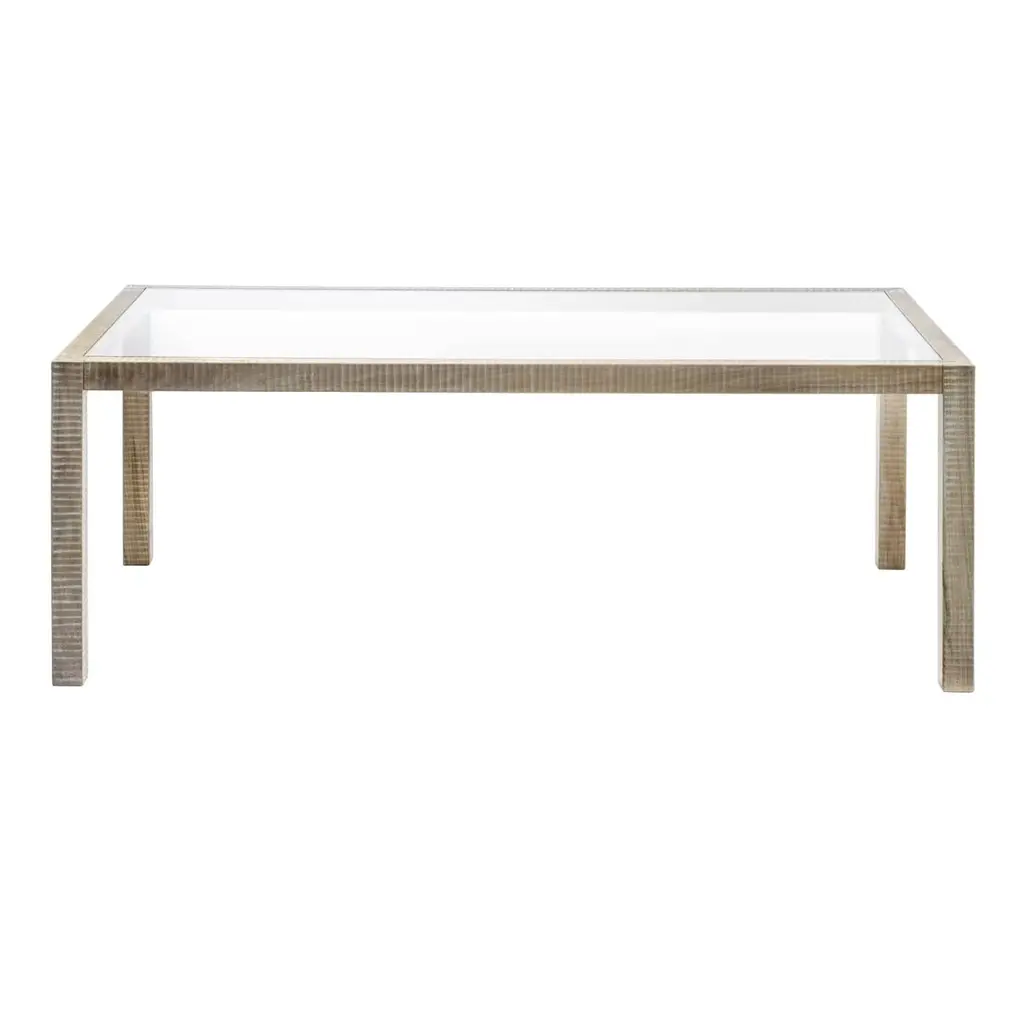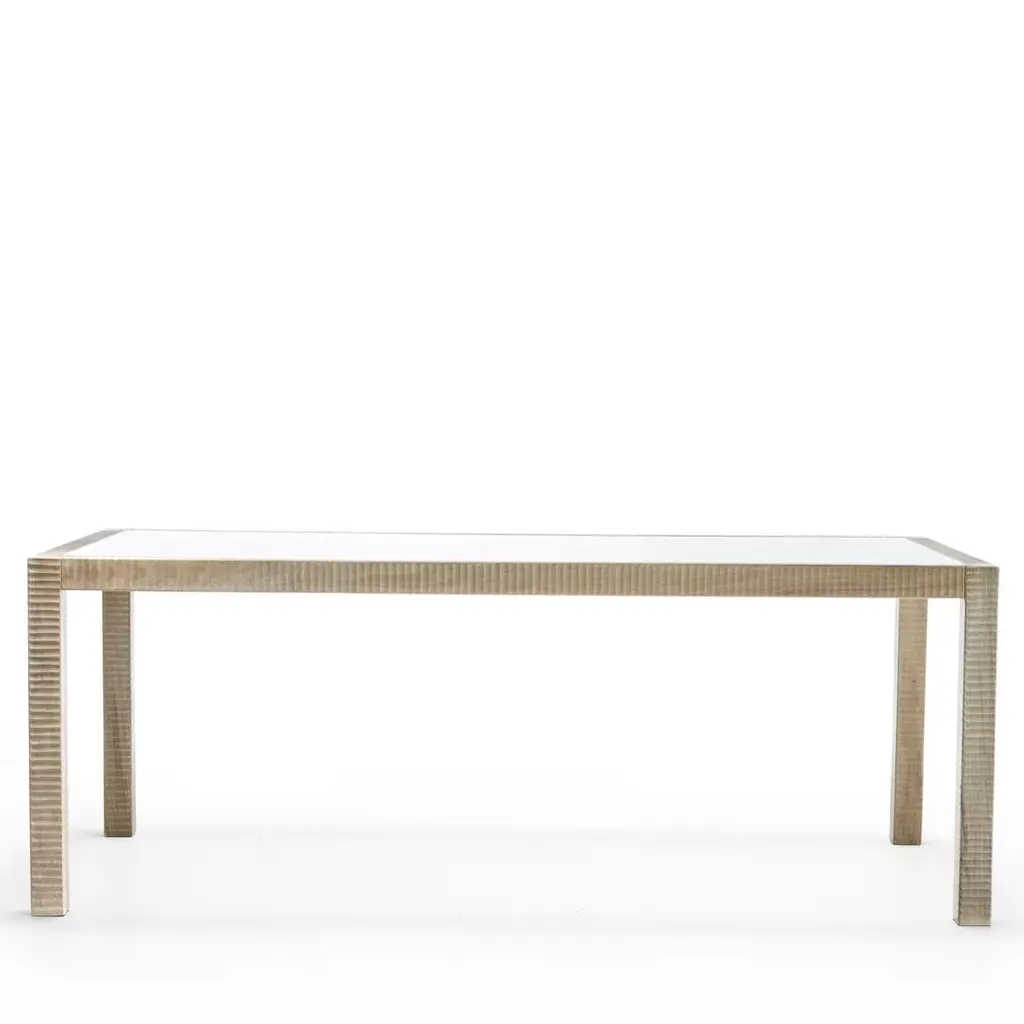 An exquisite statement piece for a contemporary dining room decor, this elegant table is deftly handcrafted of Italian walnut wood. The structure is composed of eight interlocking elements fixed with visible points and pins. The textured, geometric pattern of the surface is hand-carved with a plane. The top glass is nestled in the structure of the table, enhancing its linear yet refined silhouette.