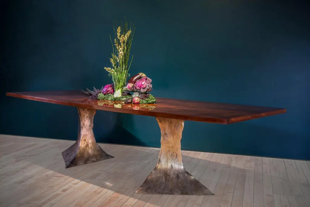 Placid dining table by Gentner DesignDimensions: D 304 x W 116 x H 76 cmMaterials: walnut, pewterGentner DesignRooted in a language of sculpture, character defining details, and world renowned craftsmanship, the work is found at the crossroads of design and art.Established in 2011, the namesake furniture label is a rare combination of aesthetic dexterity and mastery of craft resulting in furniture and objects that are expressive, formal, and transcend materiality.The collection is based in metal and incorporates only natural materials such as leather, wood, and glass in unique ways, challenging our assumptions.Christopher GentnerChristopher Gentner, with a BFA in metalsmithing from the Cleveland Institute of Art and apprenticeships under sculptors and jewelers, together with dedication to craft, quickly developed his reputation nationally as a foremost authority of metal fabrication and furniture.One of his crowning achievements was the re-creation and fabrication of the Frank Lloyd Wright Robie House gates.These unique experiences are the foundation of his design philosophy which he employs in his own line of furniture, lighting, and objects.