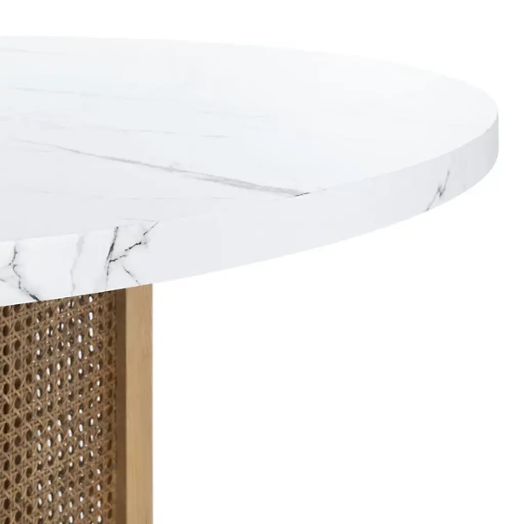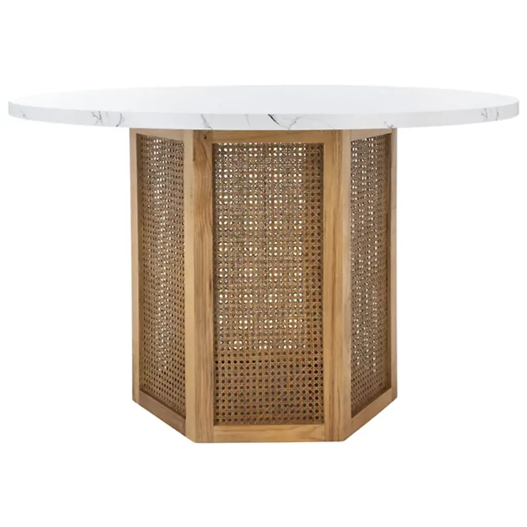 The Placida Cane Dining Table from Alder & Ore is an exquisite table that brings a rustic modern design to your home. Crafted from durable ash and MDF, it features a circular tabletop that creates a welcoming and communal atmosphere. The table’s linear framework forms a pleasant contrast to the smooth top, providing a distinctive, meshed appearance that is both contemporary and elegant. Placida gives your dining area a natural touch.
