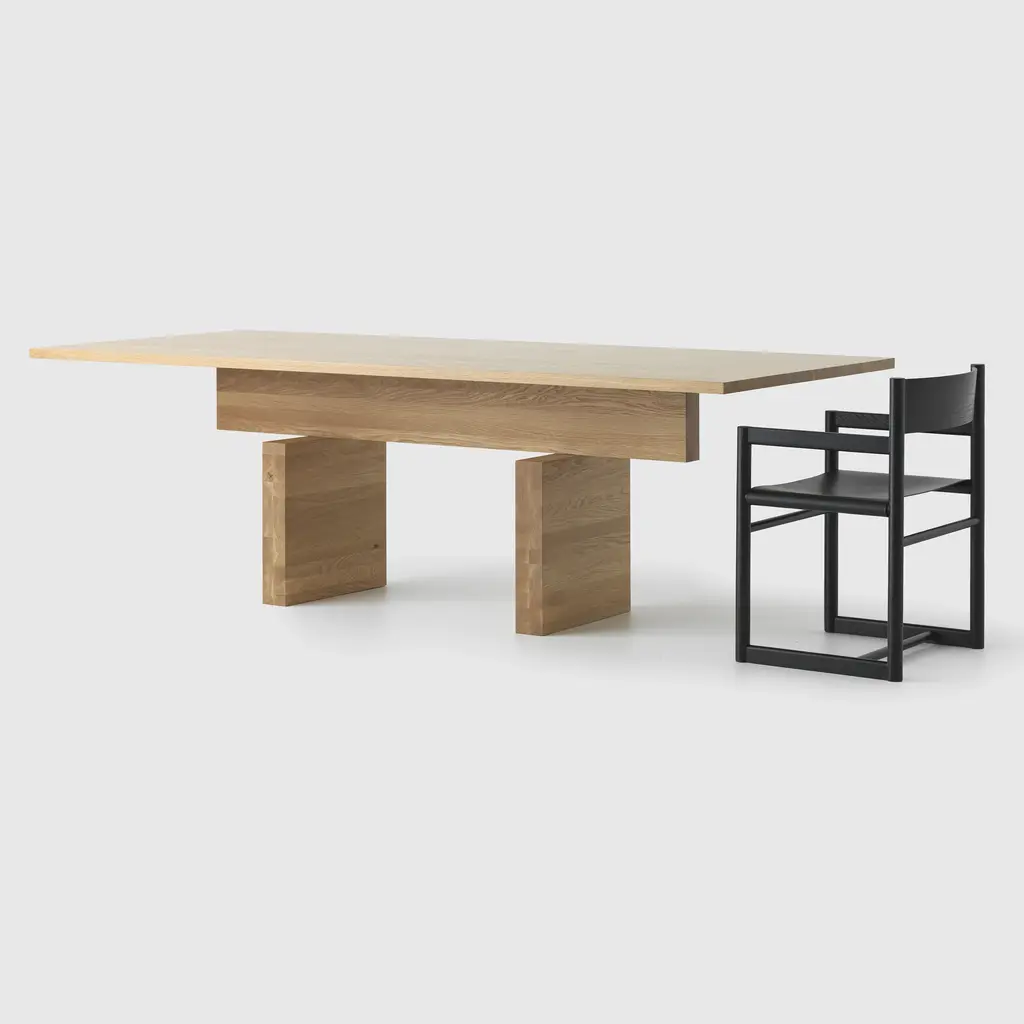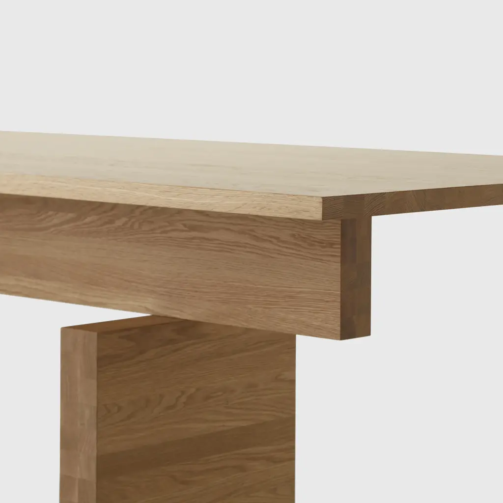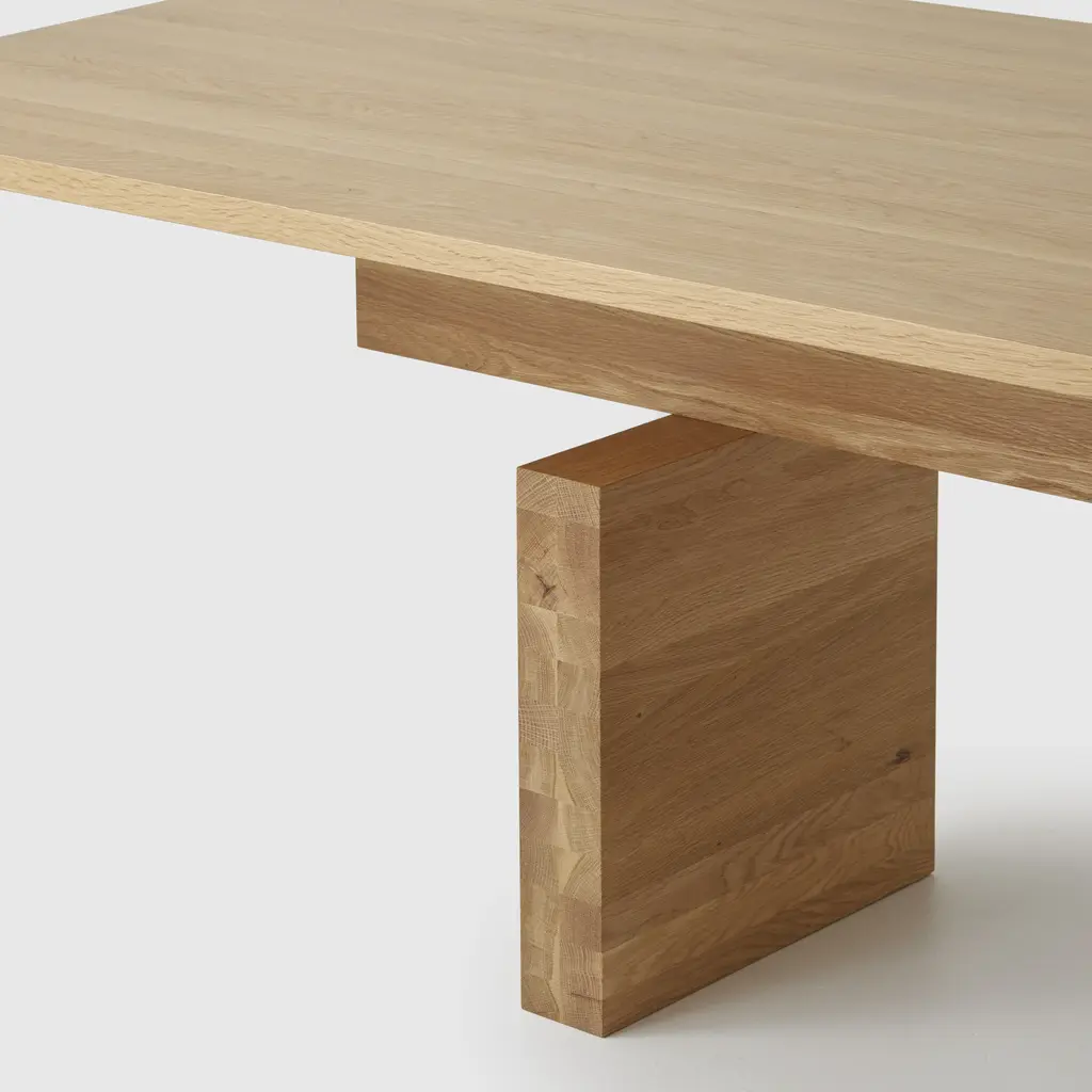 Pure and poised, the Plane Table stacks hefty slabs of timber in a seemingly impossible balancing act. Clever engineering holds the legs, cross beam and table top together in an altar-like assembly that is both useable and sculptural. Features