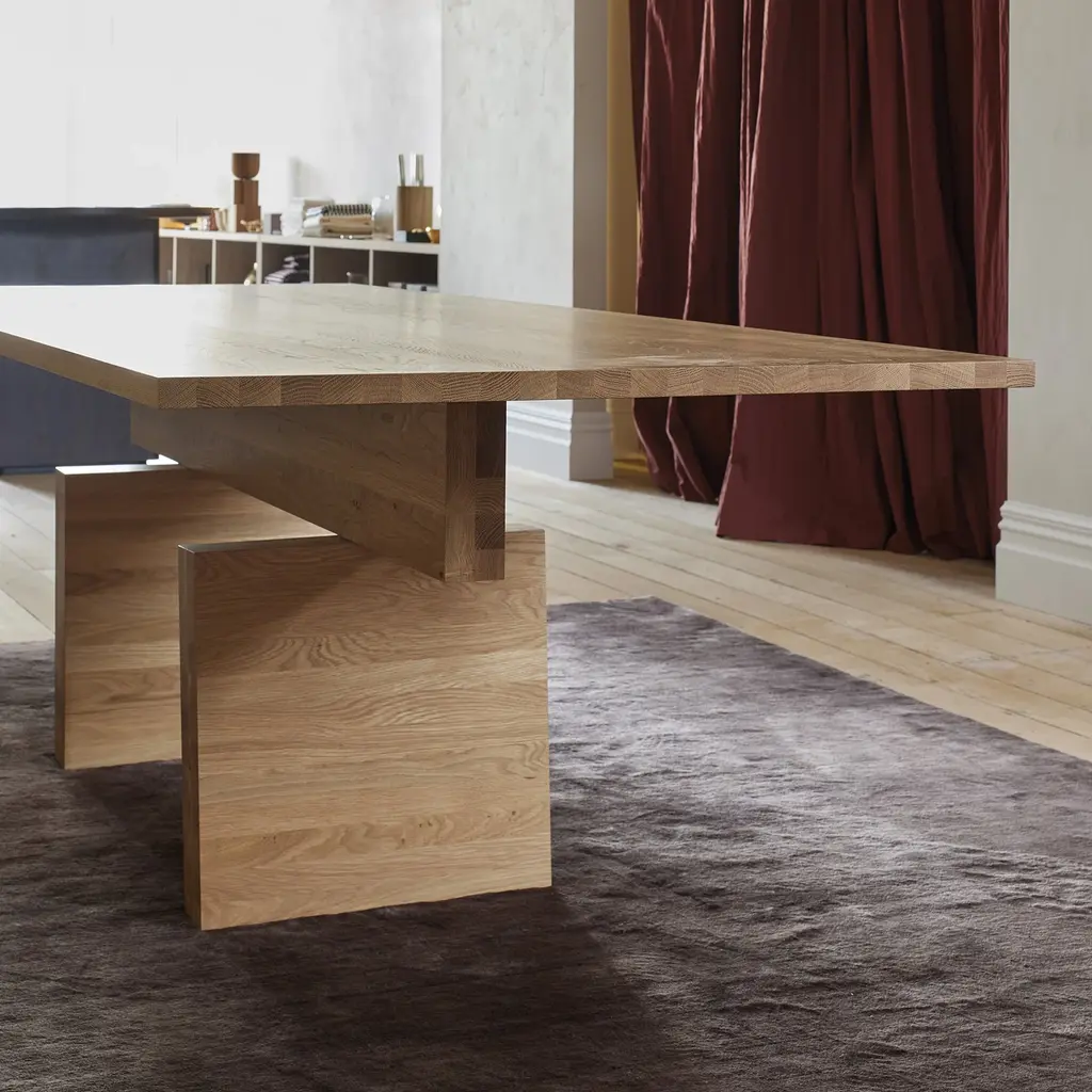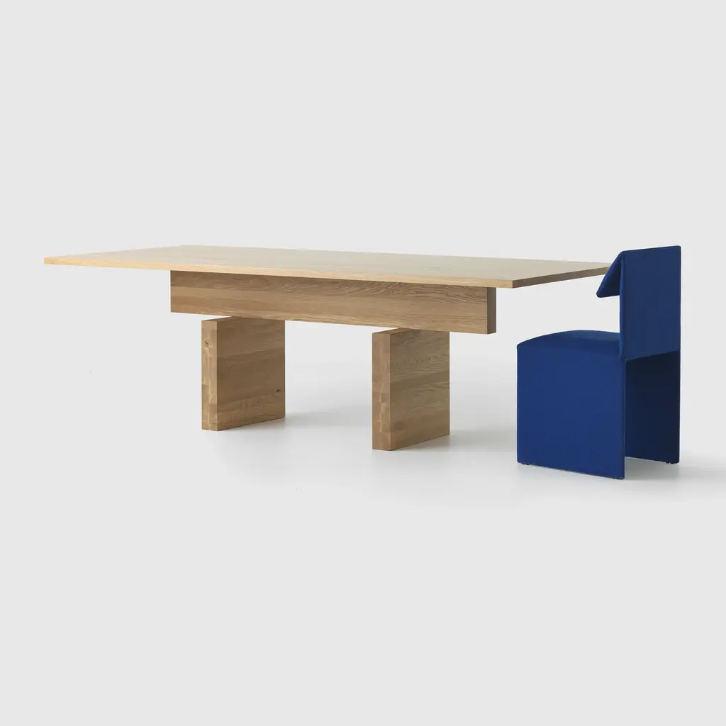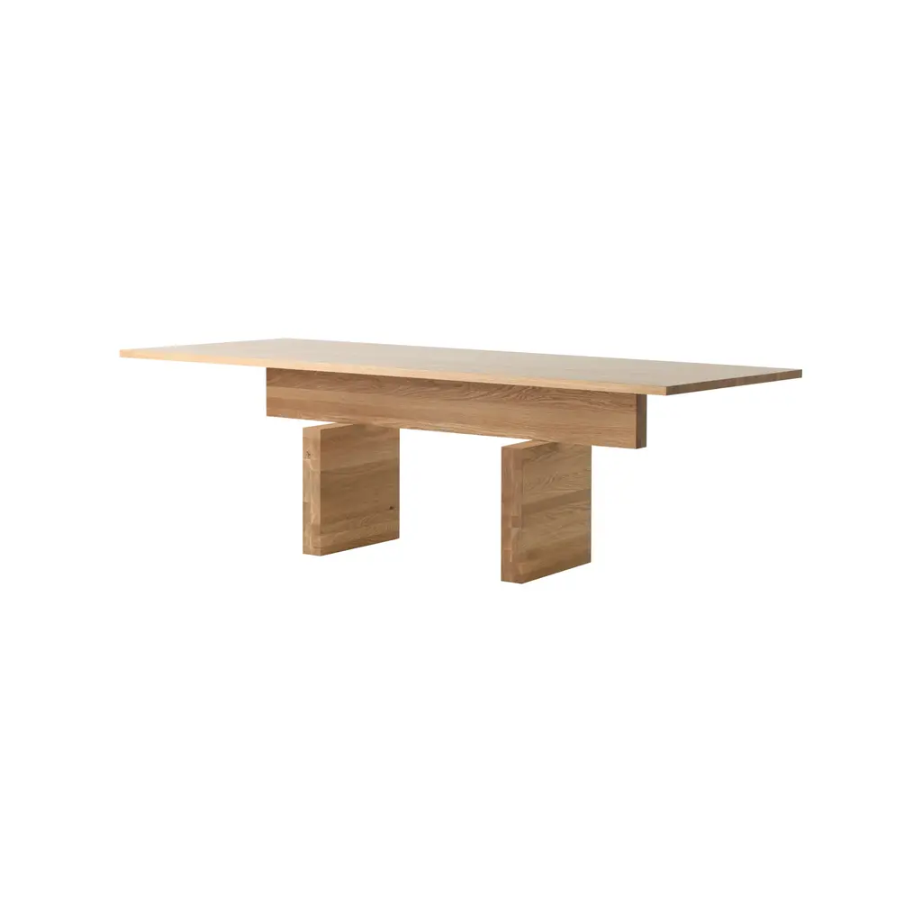 Pure and poised, the Plane Table stacks hefty slabs of timber in a seemingly impossible balancing act. Clever engineering holds the legs, cross beam and table top together in an altar-like assembly that is both useable and sculptural. Features