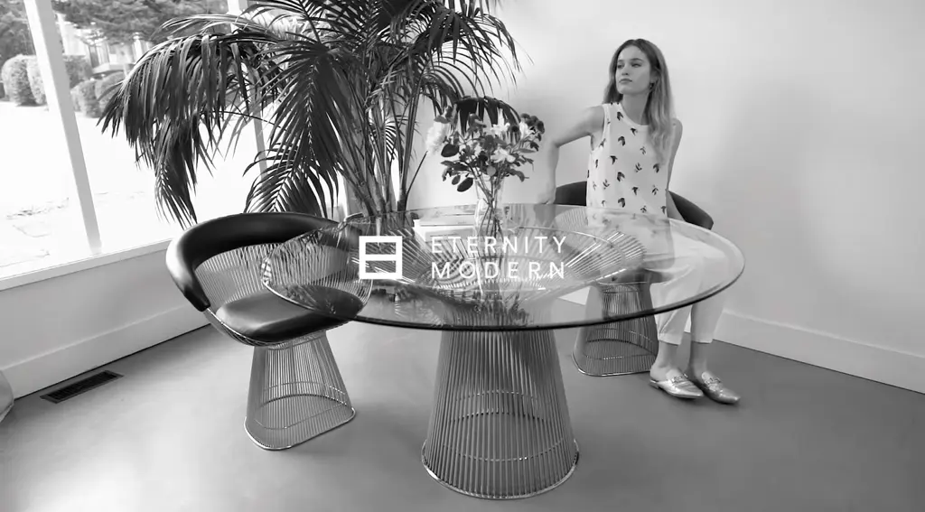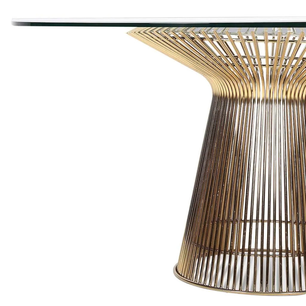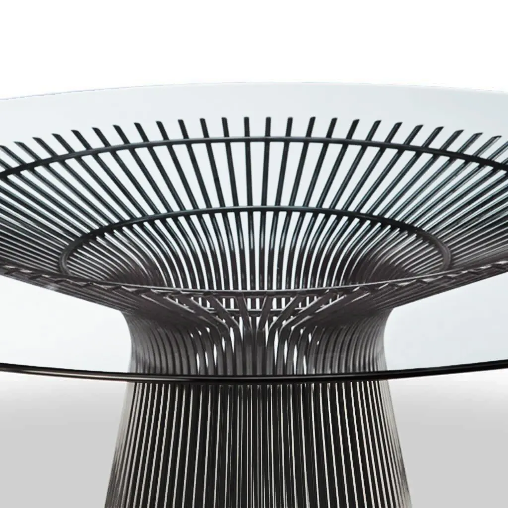 With its gentle curves and an iconic welded wire base the Warren Platner dining table is carefully constructed from reinforced stainless steel rods and a thick tempered glass top. It serves as both an ornamental artpiece as well as a functional dining table. Available in Metallic Bronze and Nickel Finish.