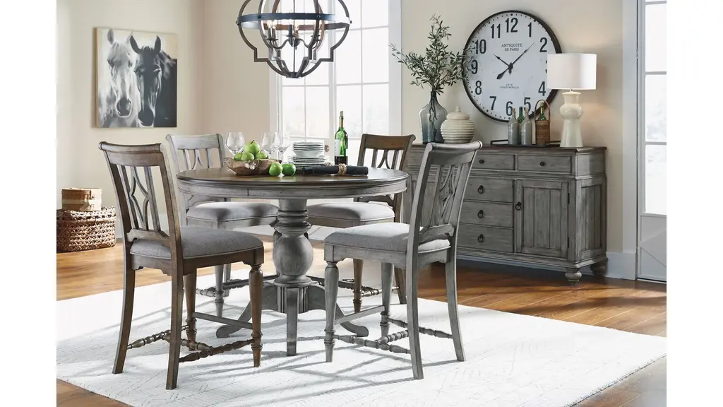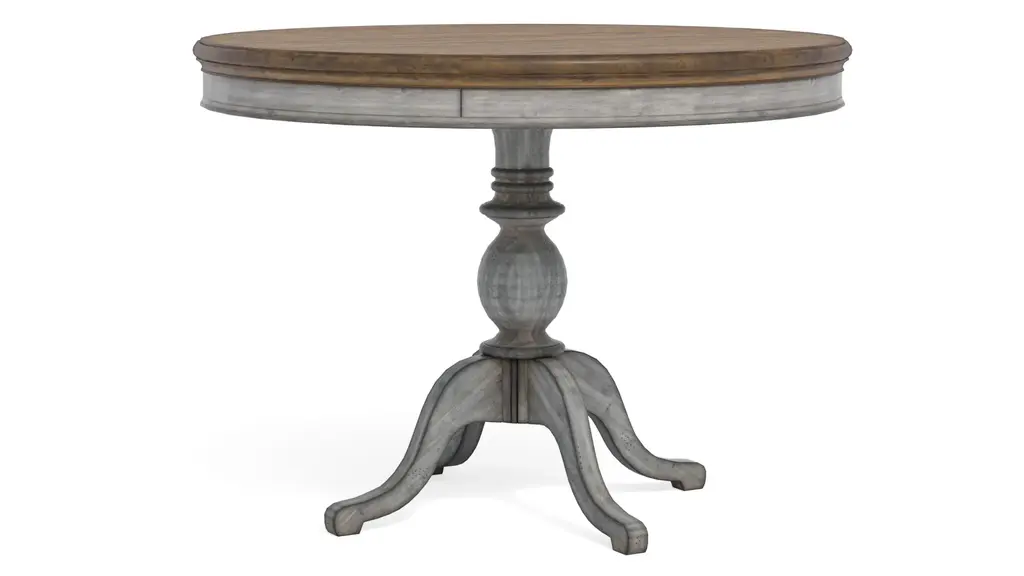 Capture the relaxed look of an inviting cottage with the Plymouth Counter Table. Taller than your standard dining table, this piece lends a more casual feel to spaces where you gather to share meals or interact. Featuring a distinctive carved pedestal base, this timeless design easily fits in smaller dining areas or game rooms and comfortably seats four. A weathered graywash finish is enhanced by the medium brown table top, evoking a vintage charm that adds warmth and character.
