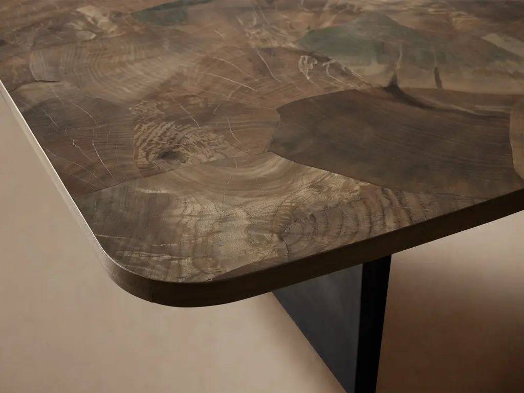 Following heavy storms, our artisan partners in Mexico search the forest for fallen trees of Mexican ash, salvaging as many as they can. Each log is oyster-cut, arranged, and stained by hand, united with fragments of sustainably grown European ash burl to create incredible, mosaic-like surfaces. Bases crafted from naturally oxidized metal add the perfect contrast, together forming the rustic beauty of our remarkable Polanco Collection.