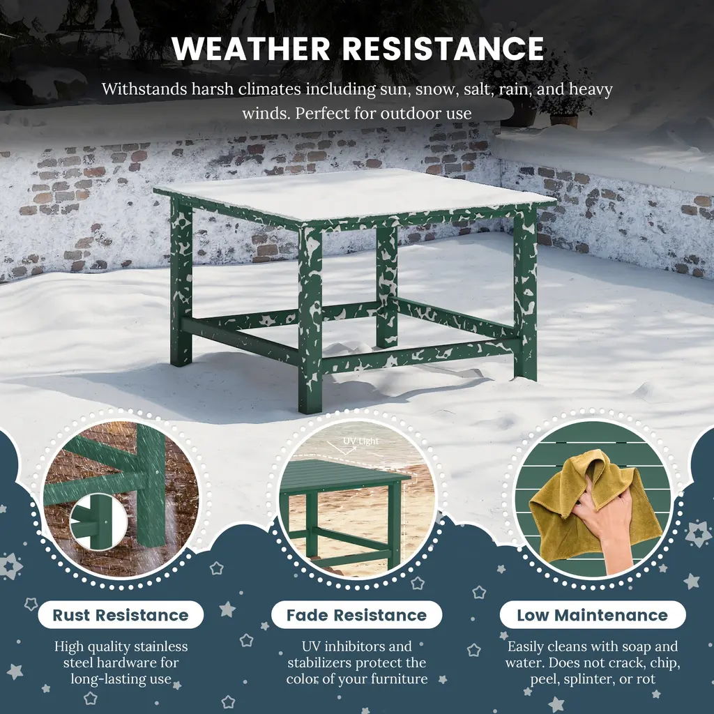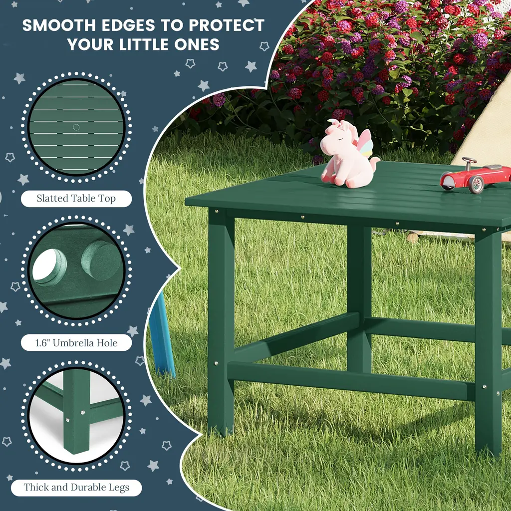 Gather your little ones for dinner or playtime with our kids' square plastic kitchen table, which can also be used as a kids' play table. Crafted from durable, kid-friendly HDPE material that is all-weather resistant, UV and fade resistant, this table will maintain its charming color season after season, especially when used as an outdoor play table. Designed not only for longevity and durability but also for safety, the rigid table top with a reinforced bottom and thick, sturdy legs ensure stability. Cleaning is a breeze: simply wipe clean with lukewarm water, mild soap, and a soft bristle brush, or use a power washer for tougher stains without worrying about damaging the durable material.While we strive to accurately represent product colors, please be aware that actual colors may vary slightly due to individual screen settings and lighting conditions. FeaturesDetails:Dining Table