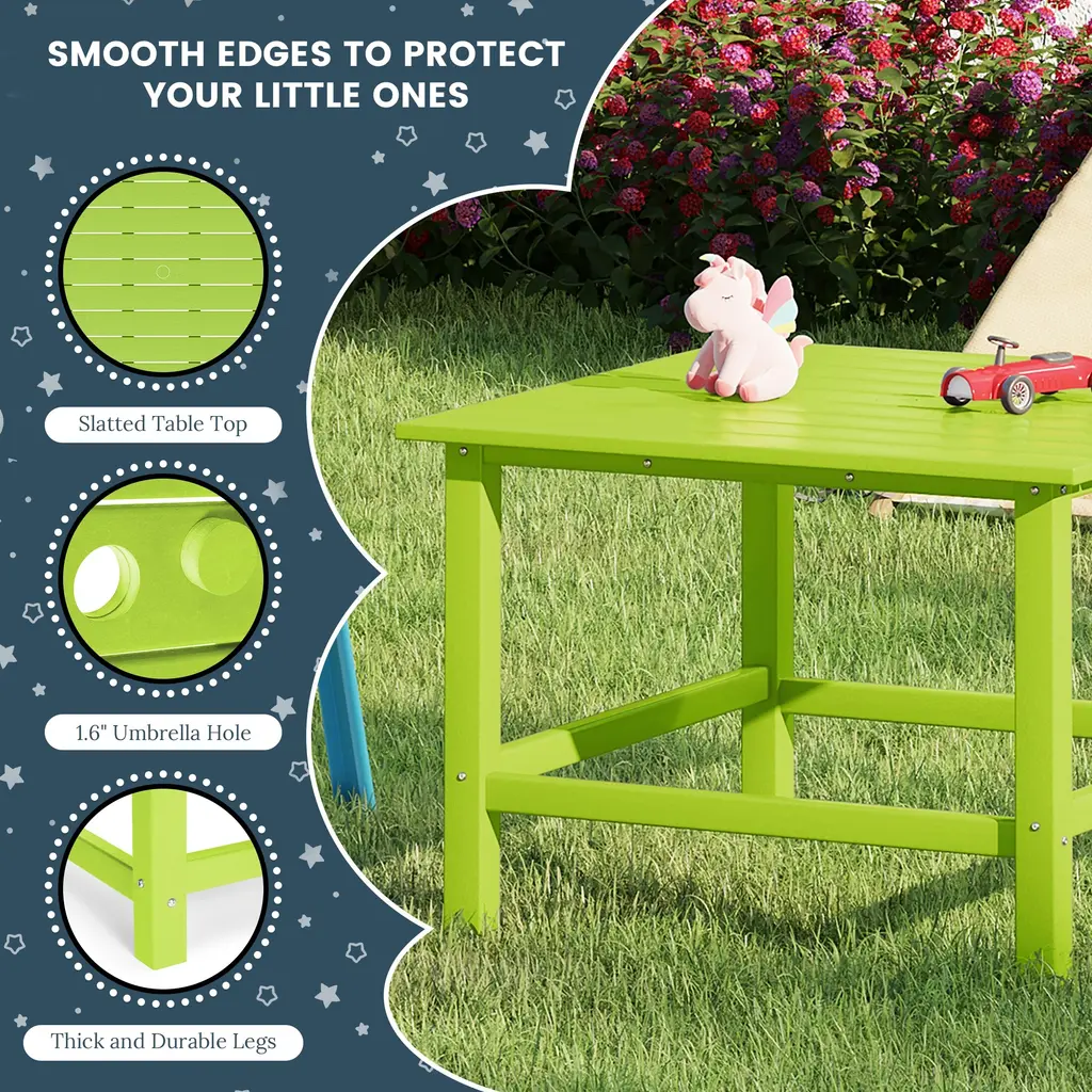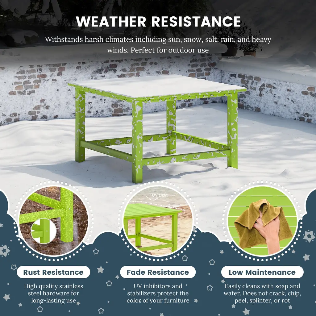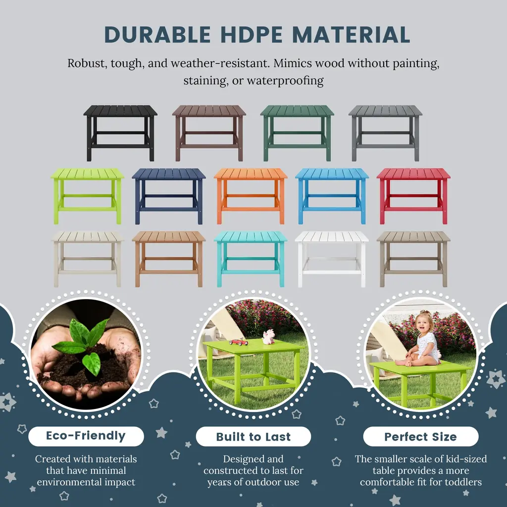 Gather your little ones for dinner or playtime with our kids' square plastic kitchen table, which can also be used as a kids' play table. Crafted from durable, kid-friendly HDPE material that is all-weather resistant, UV and fade resistant, this table will maintain its charming color season after season, especially when used as an outdoor play table. Designed not only for longevity and durability but also for safety, the rigid table top with a reinforced bottom and thick, sturdy legs ensure stability. Cleaning is a breeze: simply wipe clean with lukewarm water, mild soap, and a soft bristle brush, or use a power washer for tougher stains without worrying about damaging the durable material.While we strive to accurately represent product colors, please be aware that actual colors may vary slightly due to individual screen settings and lighting conditions. FeaturesDetails:Dining Table