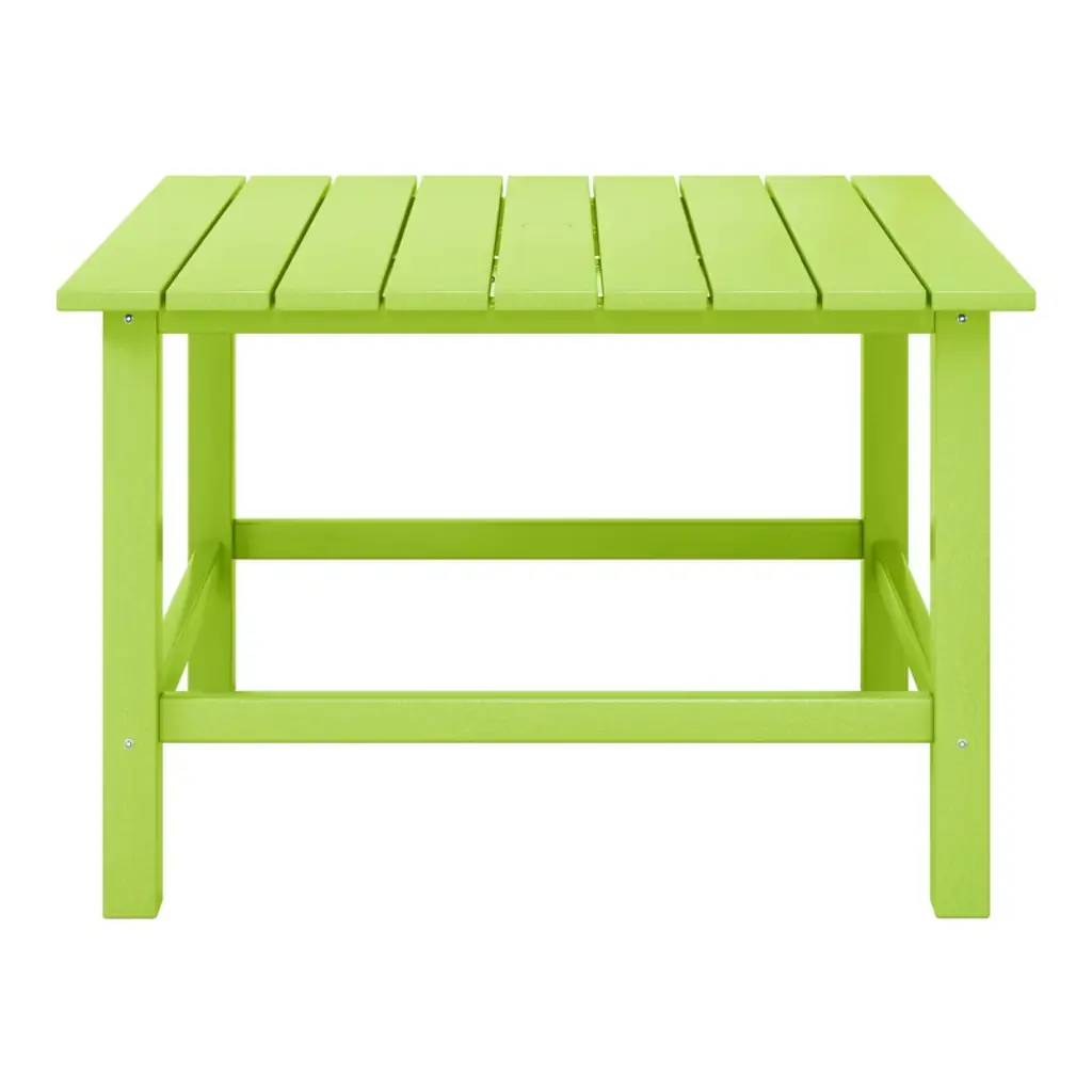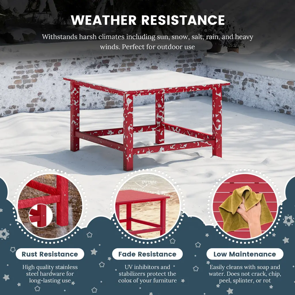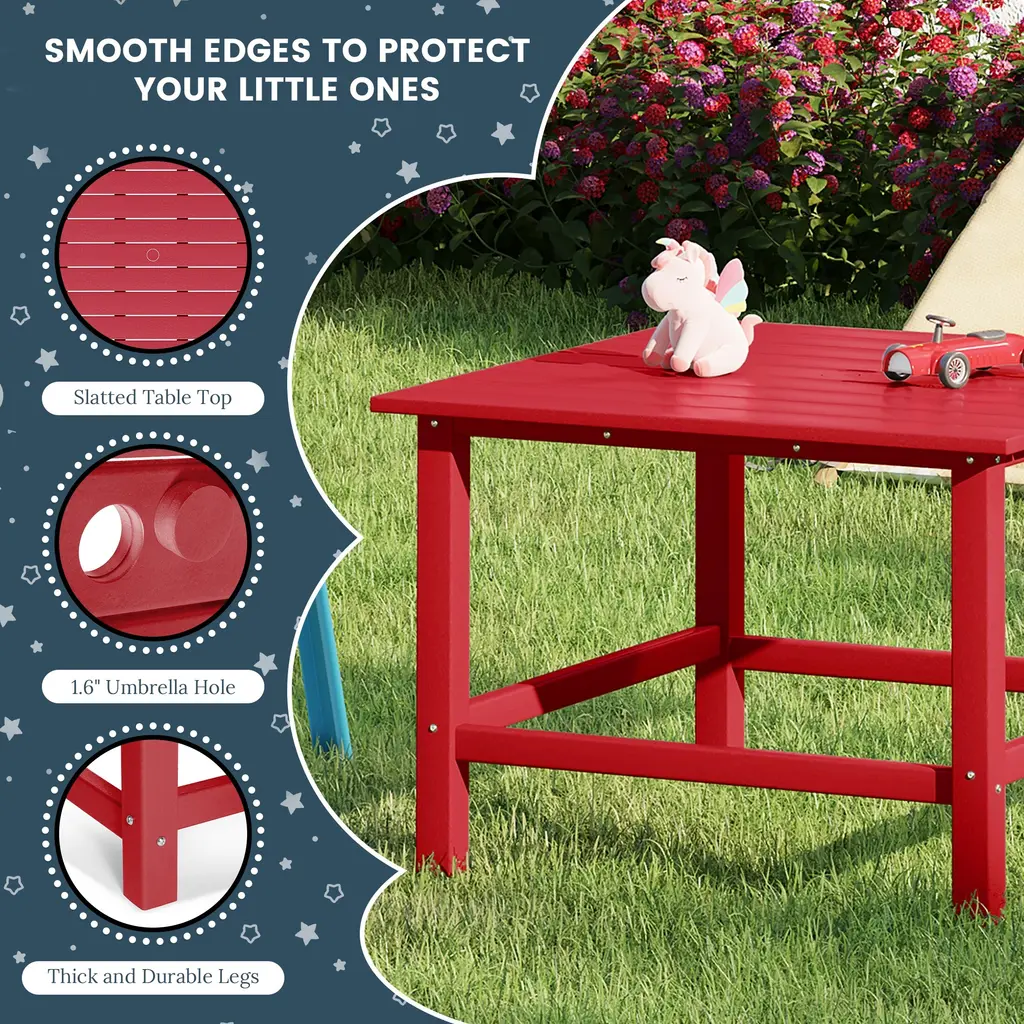 Gather your little ones for dinner or playtime with our kids' square plastic kitchen table, which can also be used as a kids' play table. Crafted from durable, kid-friendly HDPE material that is all-weather resistant, UV and fade resistant, this table will maintain its charming color season after season, especially when used as an outdoor play table. Designed not only for longevity and durability but also for safety, the rigid table top with a reinforced bottom and thick, sturdy legs ensure stability. Cleaning is a breeze: simply wipe clean with lukewarm water, mild soap, and a soft bristle brush, or use a power washer for tougher stains without worrying about damaging the durable material.While we strive to accurately represent product colors, please be aware that actual colors may vary slightly due to individual screen settings and lighting conditions. FeaturesDetails:Dining Table