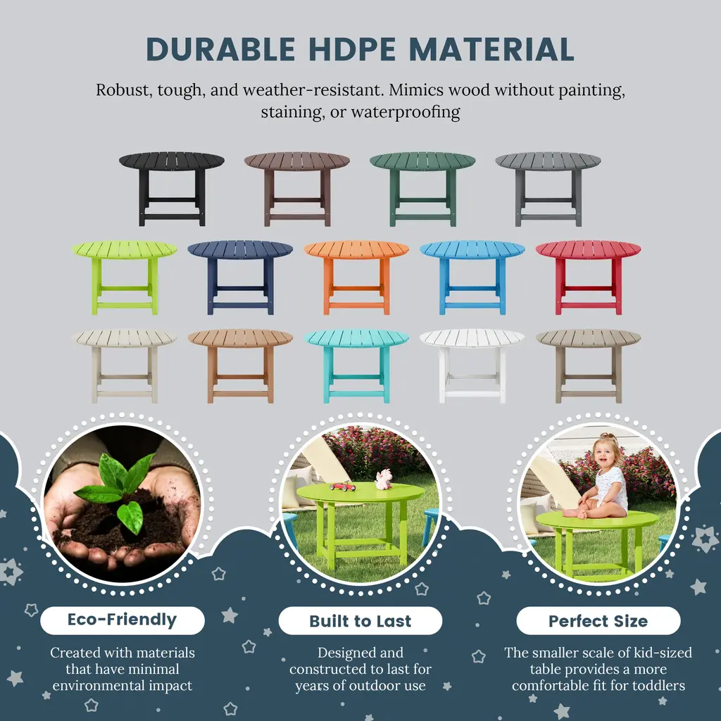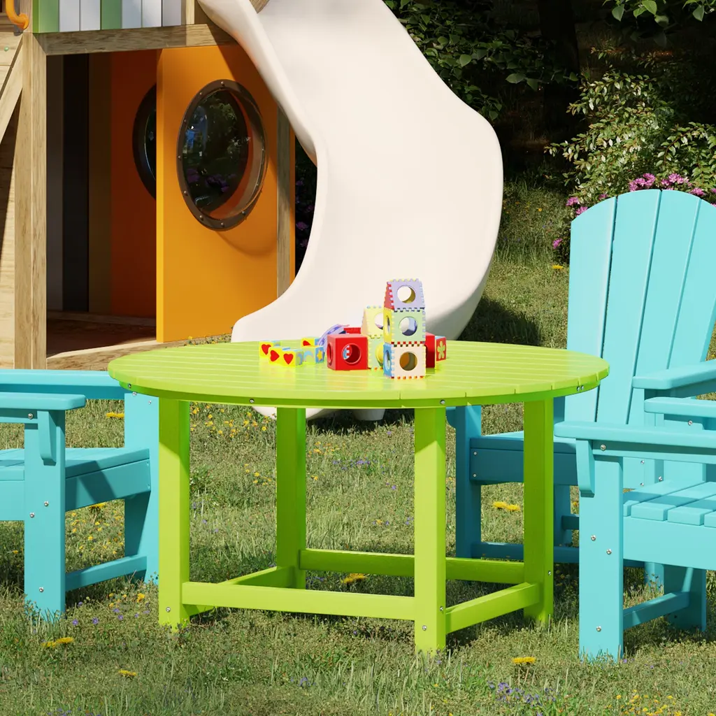 Gather your little ones for dinner or playtime with our kids' plastic kitchen table, which can also be used as a kids' play table. Crafted from durable, kid-friendly HDPE material that is all-weather resistant, UV and fade resistant, this table will maintain its charming color season after season, especially when used as an outdoor play table. Designed not only for longevity and durability but also for safety, the rigid table top with a reinforced bottom and thick, sturdy legs ensure stability. Cleaning is a breeze: simply wipe clean with lukewarm water, mild soap, and a soft bristle brush, or use a power washer for tougher stains without worrying about damaging the durable material.While we strive to accurately represent product colors, please be aware that actual colors may vary slightly due to individual screen settings and lighting conditions. FeaturesDetails:Dining Table