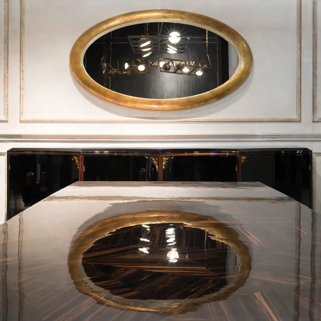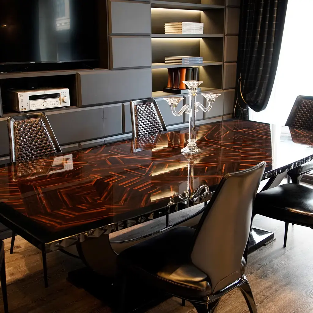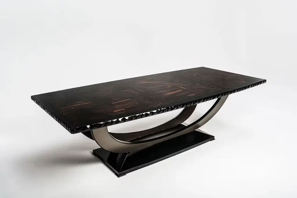 Large Macassar ebony table: mirror-polished veneered top with 3D faceted solid wood edge, base with arched legs in wood and painted steel.