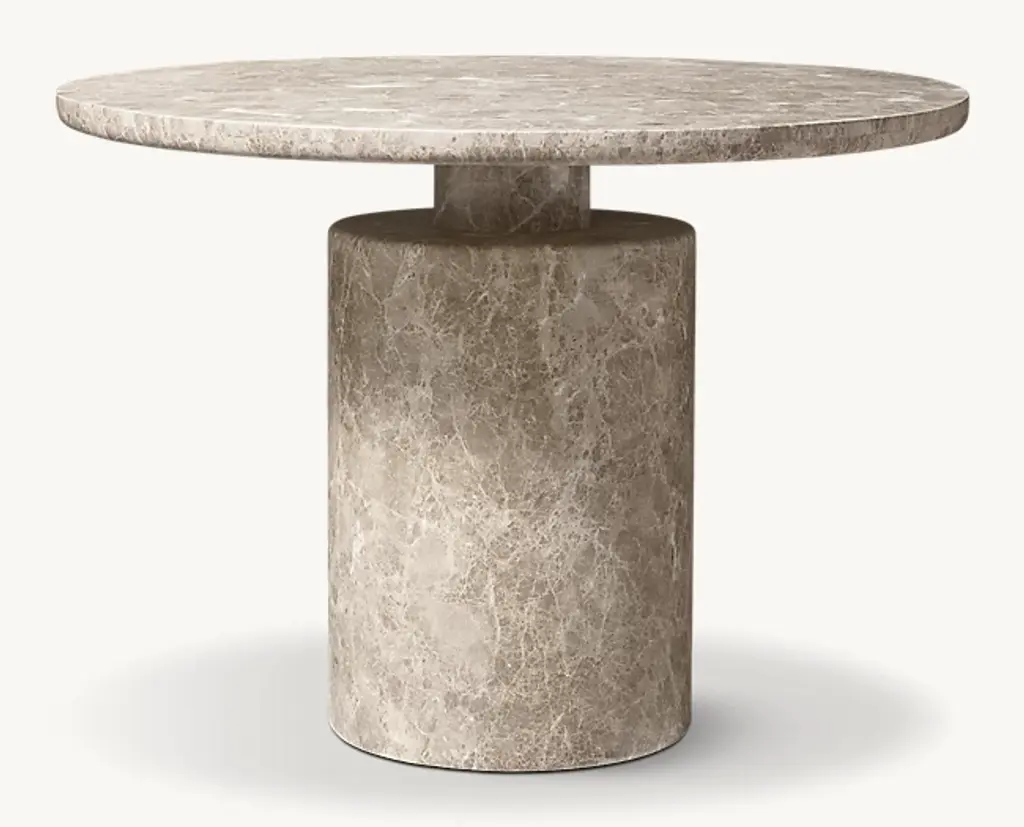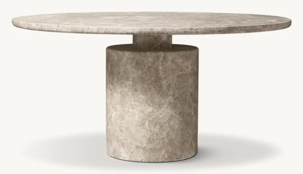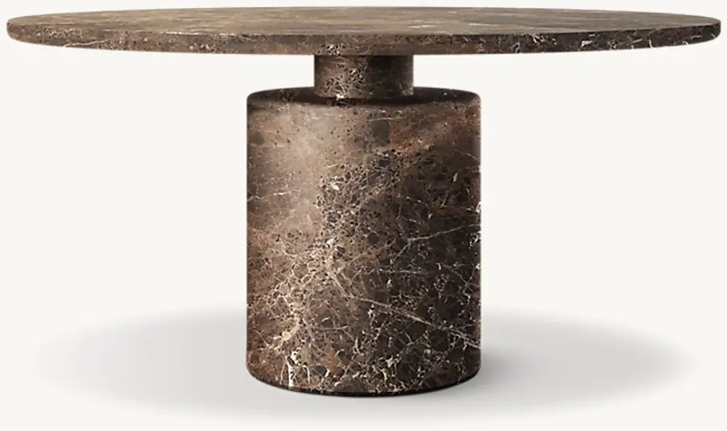 Evoking the expressive designs of 1970s postmodernism, the Ponti dining table combines a bold geometric silhouette with the beauty of carved stone. Grounded in a pedestal base that supports a slender top, the dynamic form is marked by a cinched midsection. Tonal variations and rich vein patterning make each piece one of a kind. SHOP THE ENTIRE COLLECTION
