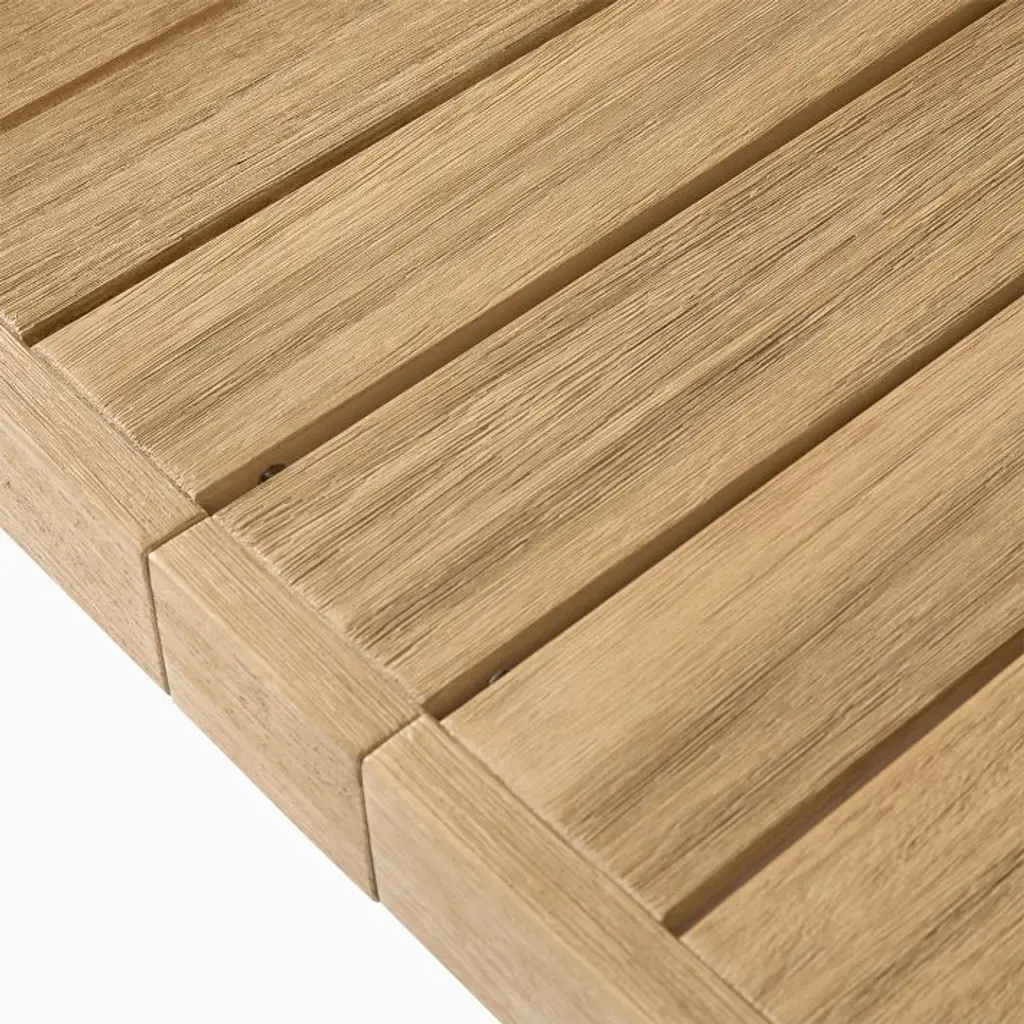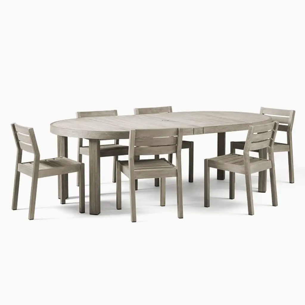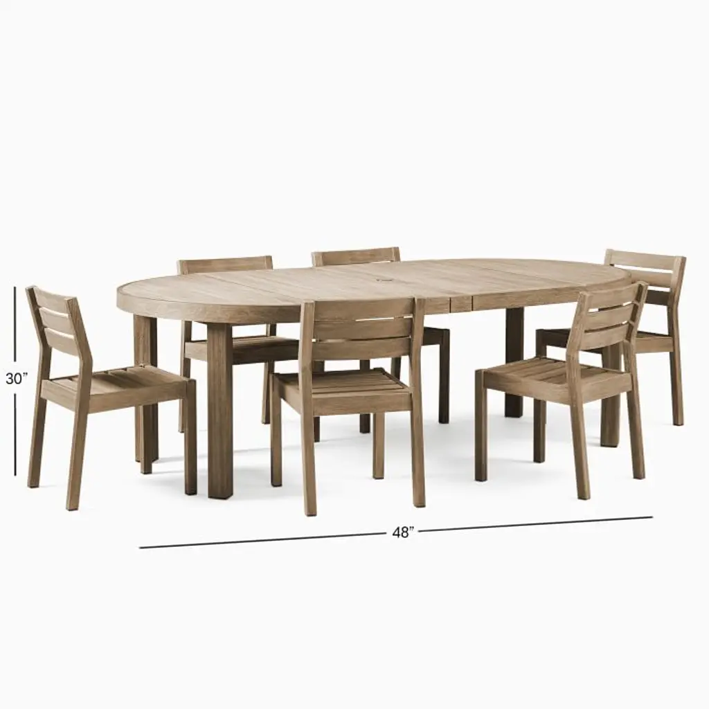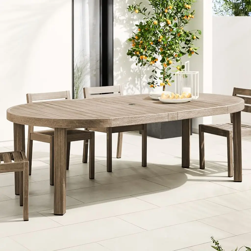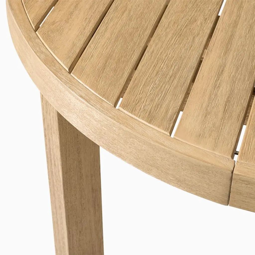With its wire-brushed frame and weathered finish, our Portside Outdoor Collection feels rustic and refined. Crafted of moisture-resistant, sustainably sourced wood, this round dining table expands to seat up to eight comfortably. Expandable design has 3 width options: 48", 70.5", 93". Moisture-resistant solid mahogany and solid eucalyptus wood with wire-brushed surface. Made with FSC®-certified wood from responsibly managed forests. Table expands via two drop-in leaves (included). This contract-grade item is manufactured to meet the demands of commercial use in addition to residential. See more. Made in Indonesia.