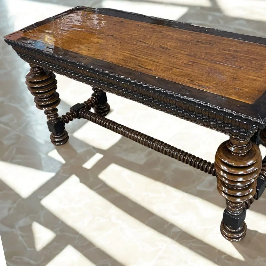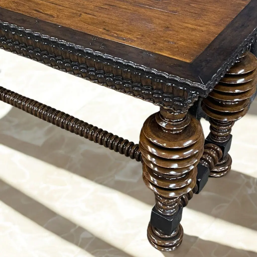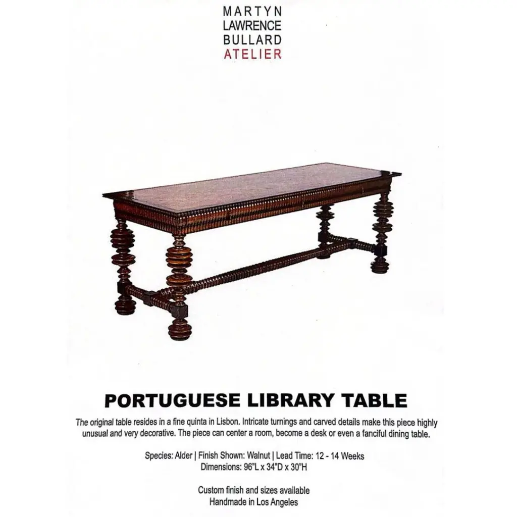 Martyn Lawrence Bullard's custom Portuguese library table.The design taken from a table found in a quinta in Lisbon, the intricate turning and carved details make this piece highly unusual and very decorative. This piece can centre a room, become a desk or even a fanciful dining table.