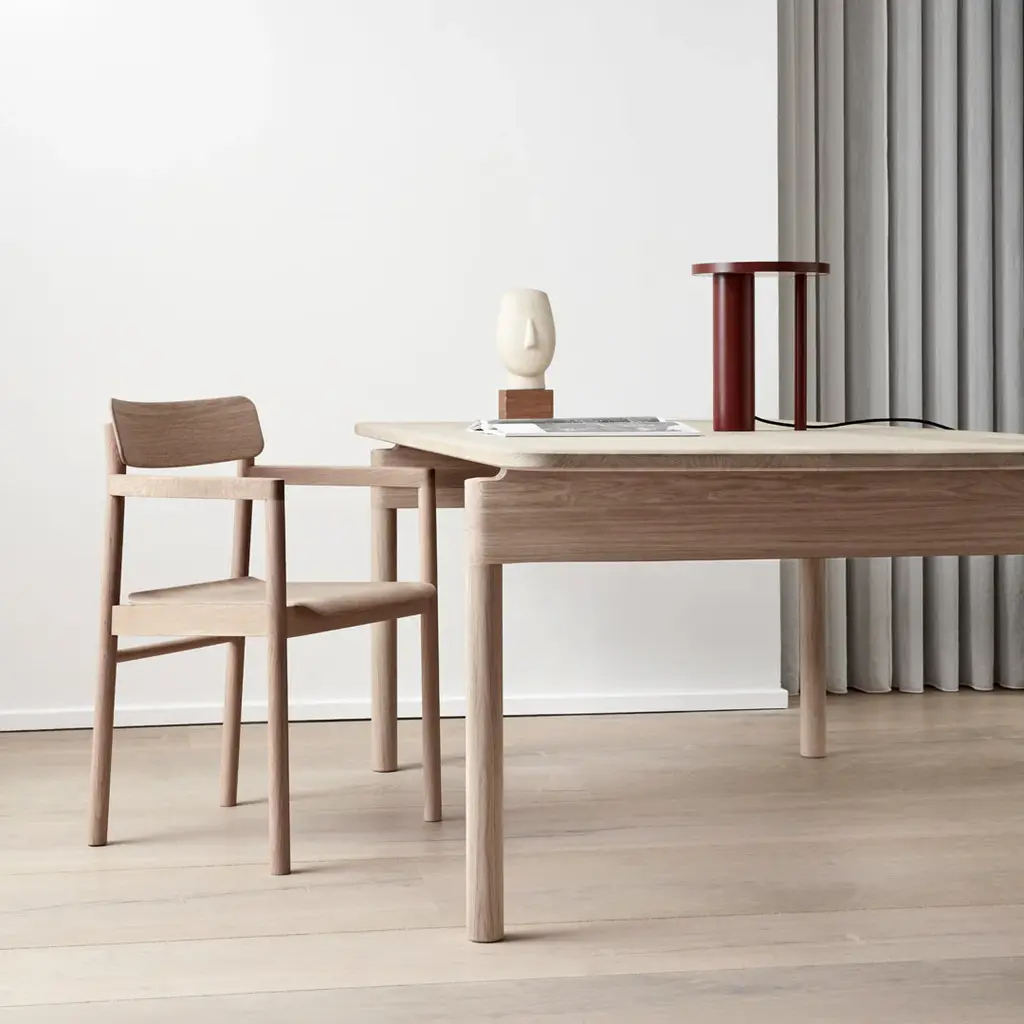 The Post Table illustrates the idea of eliminating anything extra to solely focus on the essential. A classic design expressed with modern minimalism, the table is made from solid oak, featuring loads of legroom in the wide space between the legs on either end. The table top is available in three lengths, supported by the same cylindrical legs as the Post Chair. Simplicity imbued with a sense of beauty is at the core of the Post Collection from Cecilie Manz. The name is a nod to the former home of the Royal Mail, renovated into our flagship showroom in Copenhagen. Clean, uncluttered lines are the signature traits of the Post Chair, boasting a solid wood frame that reflects our heritage of wood craftsmanship and appreciation for authentic materials. The Post Chair is upright and unassuming. The plywood seat and back are light yet sturdy, while the arms offer just enough support with a minimal use of space. Add to that the option of an upholstered seat in leather or fabric, and you have a subtle design that could easily fit into a residential setting, restaurant, café or corporate environment. Like the chairs, the Post Table's minimalist design makes it suitable for dining or meetings in corporate, private or hospitality settings. For designer Cecilie Manz, her design process starts with examining the purpose of a piece of furniture. By stripping the concept down to only what's necessary, the form that emerges from the function is pure and purposeful.