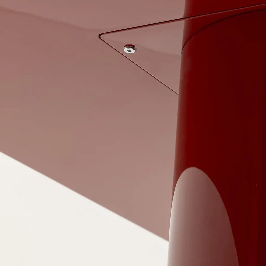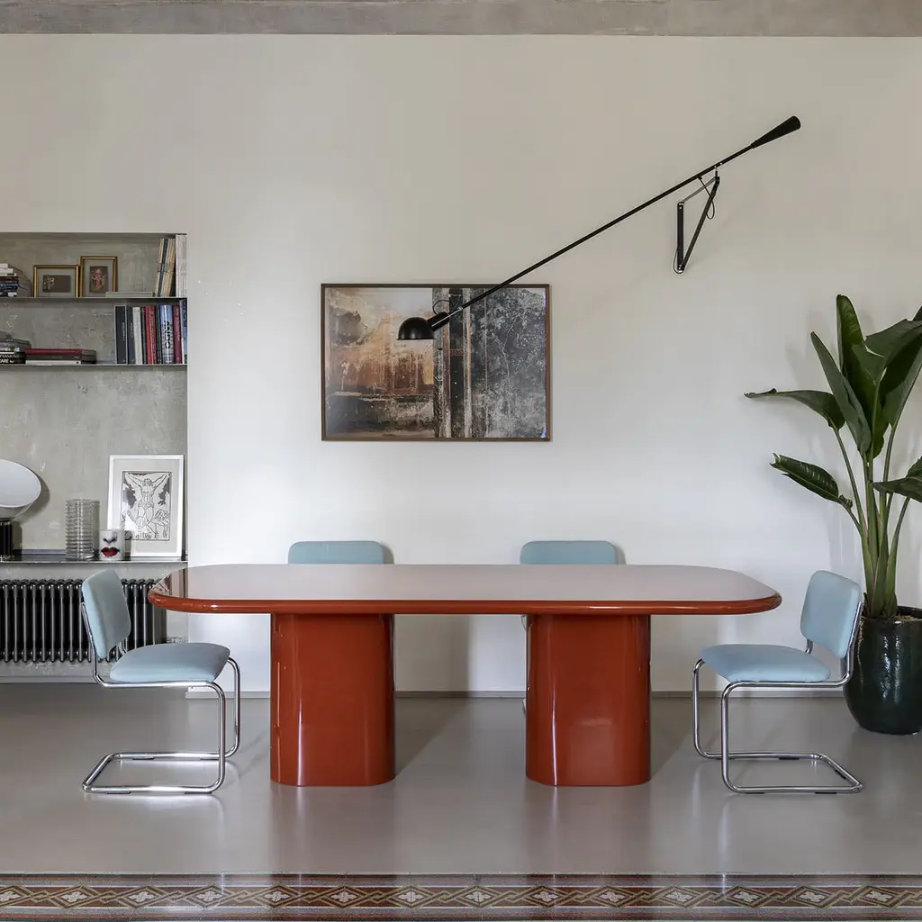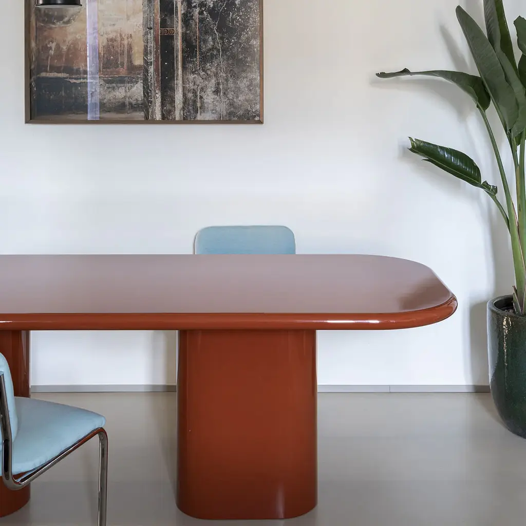 The Pranzo red dining table merges modern craftsmanship with a nod to 1960s design aesthetics. Featuring a sleek, super glossy lacquered MDF structure, this table embodies a playful yet monolithic charm, reminiscent of the soft curves and vibrant hues characterized by mid-century decor. It serves as a striking centerpiece for any dining area, balancing formality with a sense of joyous liveliness. The design draws inspiration from nostalgic influences, creating an inviting atmosphere for meals and gatherings.