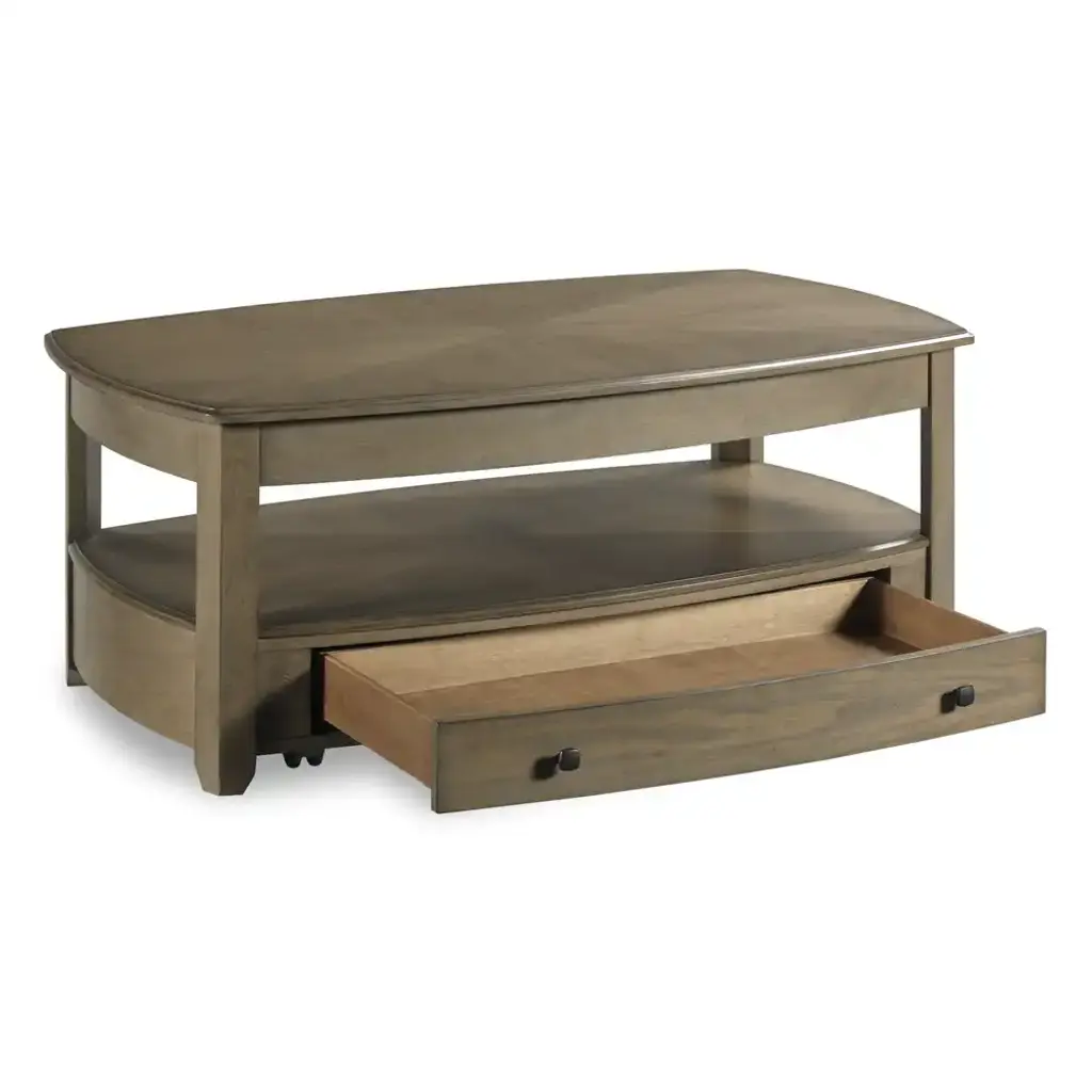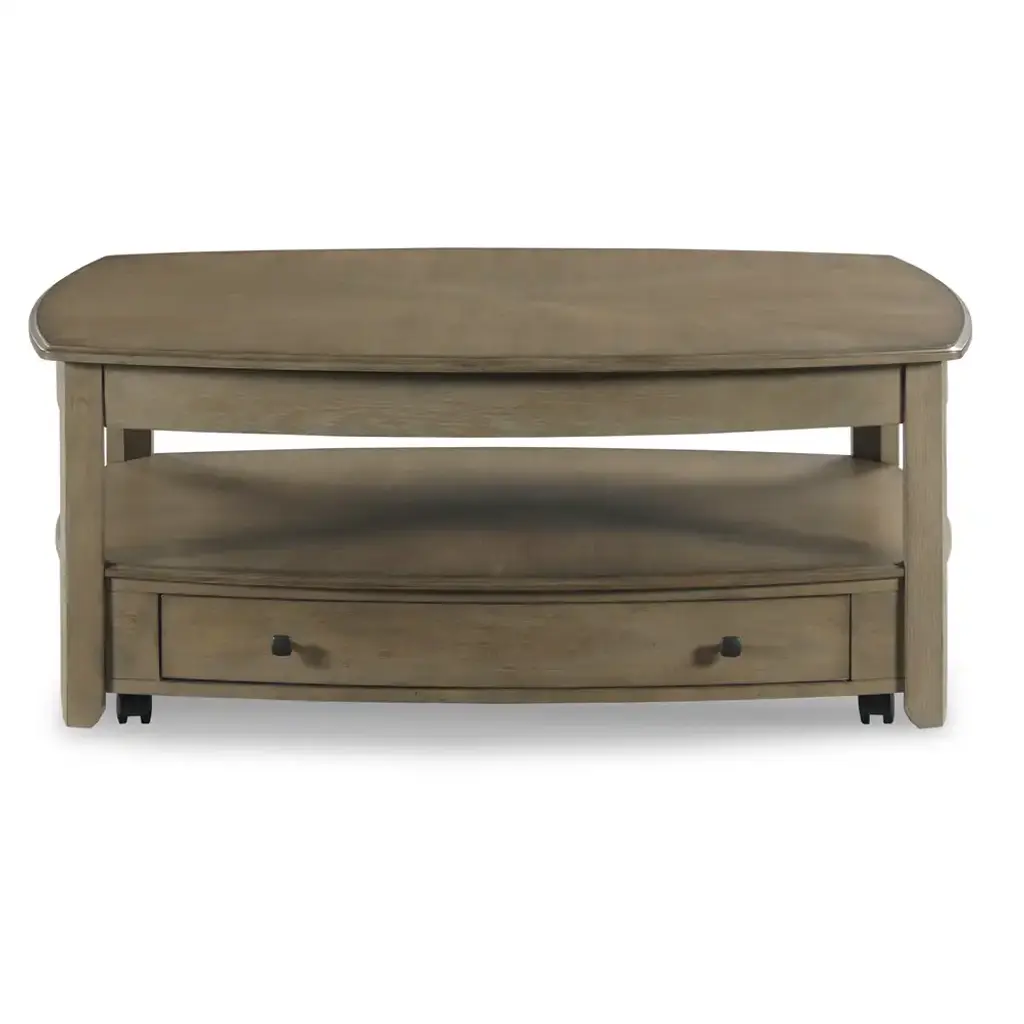 The Rectangular Lift-Top Coffee Table from the Primo III collection blends transitional and casual styling with practical functionality. Crafted from white oak in a rich Hazel finish, it showcases a distinctive reverse diamond pattern on the top, adding a dynamic visual element. The lift-top feature provides versatility for work or dining, while two bottom drawers offer concealed storage for essentials. An open shelf enhances accessibility, making this thoughtfully designed piece a stylish and adaptable centerpiece for any living space.