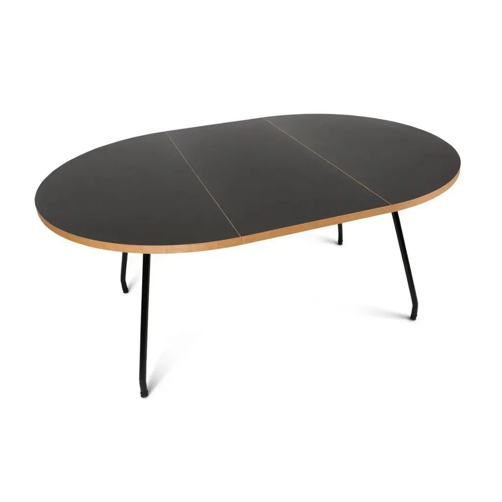 Like the other members of the Primum furniture family, Primum Table is characterized by its well-proportioned and tortuous shapes. The dining table is an extension table, and the table top comes in oak veneer or black linoleum both with a decorative oiled oak edge. Extension leaves in black linoleum are sold separately.