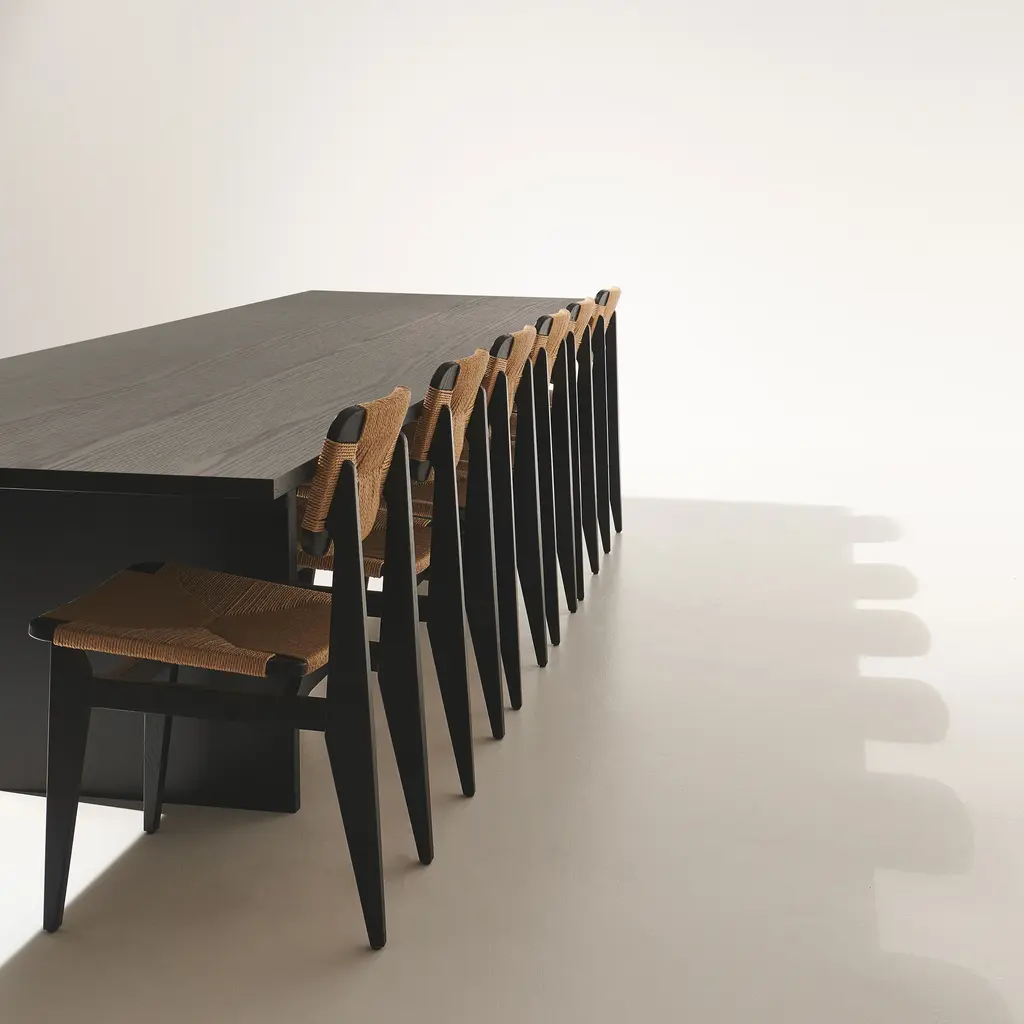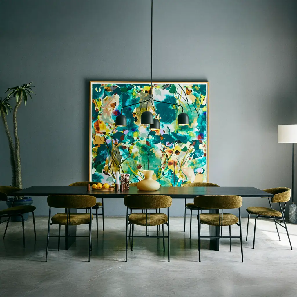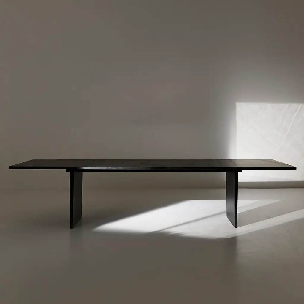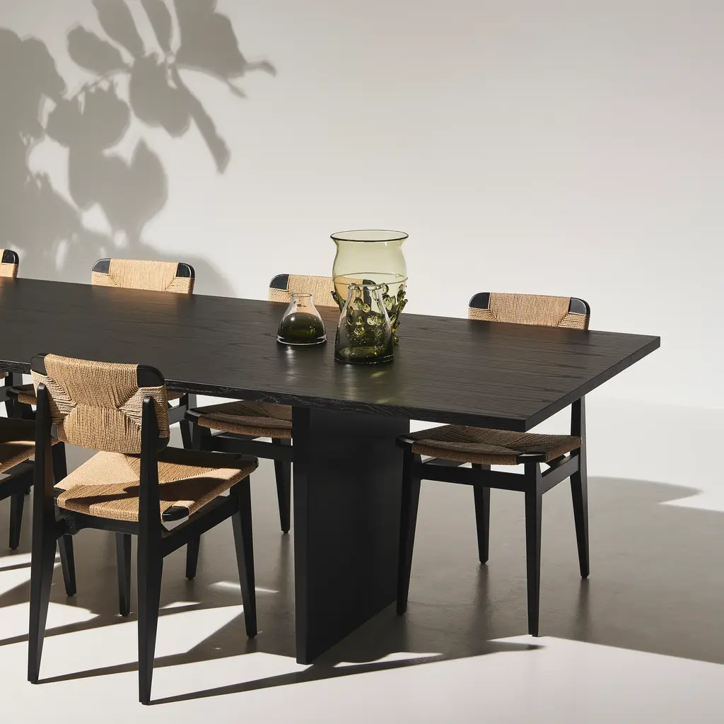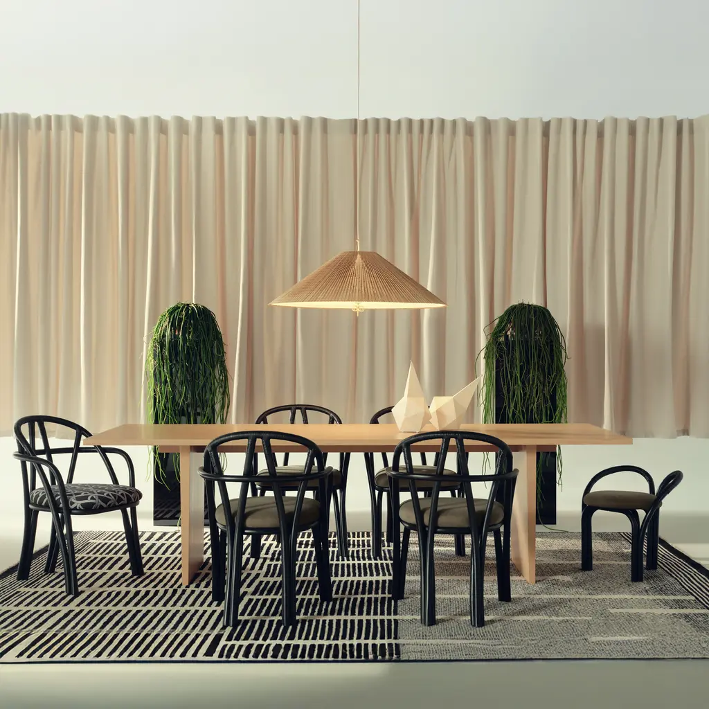 With conviviality at the forefront, Space Copenhagen elected to make Private Dining Table slightly narrower than usual to bring guests closer together and encourage the conversation to flow. Gubi offers the table in a pair of sizes, both sharing the inspiration of traditional Japanese joinery. Veneered wood tabletops, in brown-black stained ash or light stained oak, are joined to the elegantly tapering end panels via a discreet solid-wood crossbeam for a sturdy stance and a refined appearance.