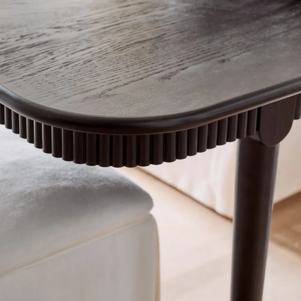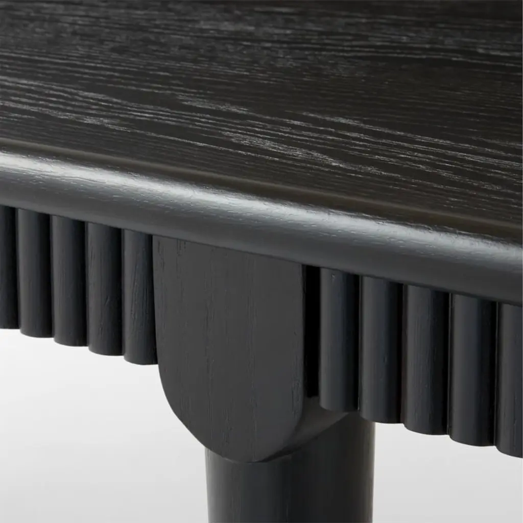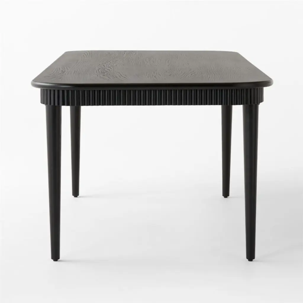 Ebonized oak certified sustainable by the Forest Stewardship Council (FSC) goes on display in this French vintage-inspired design by London-based James Patterson. Natural wood grain is spotlighted throughout, accentuated by the table's clean lines, rounded edges and fluted apron details. Table comfortably seats eight. CB2 exclusive.