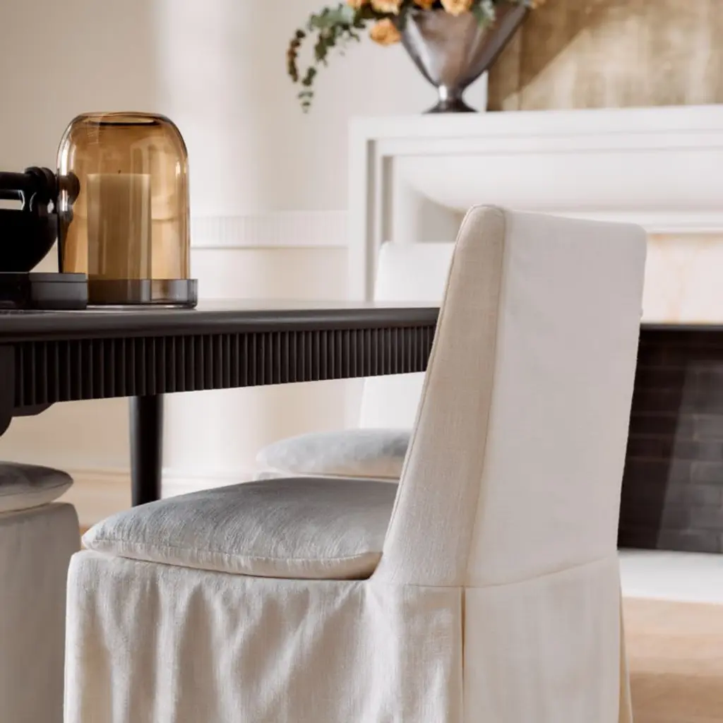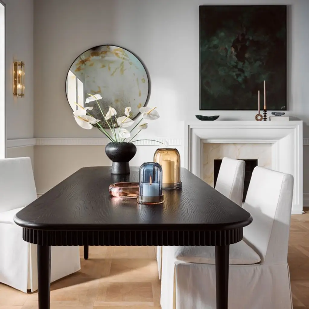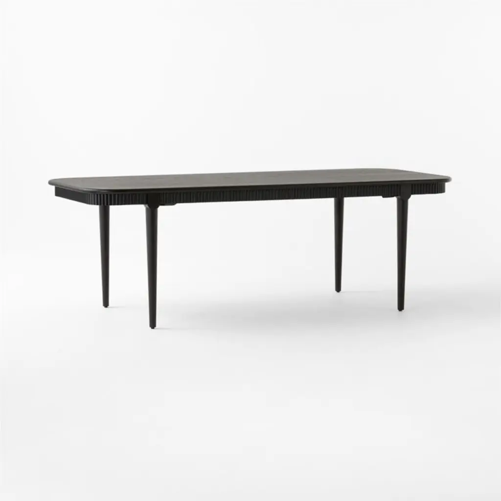 Ebonized oak certified sustainable by the Forest Stewardship Council (FSC) goes on display in this French vintage-inspired design by London-based James Patterson. Natural wood grain is spotlighted throughout, accentuated by the table's clean lines, rounded edges and fluted apron details. Table comfortably seats eight. CB2 exclusive.