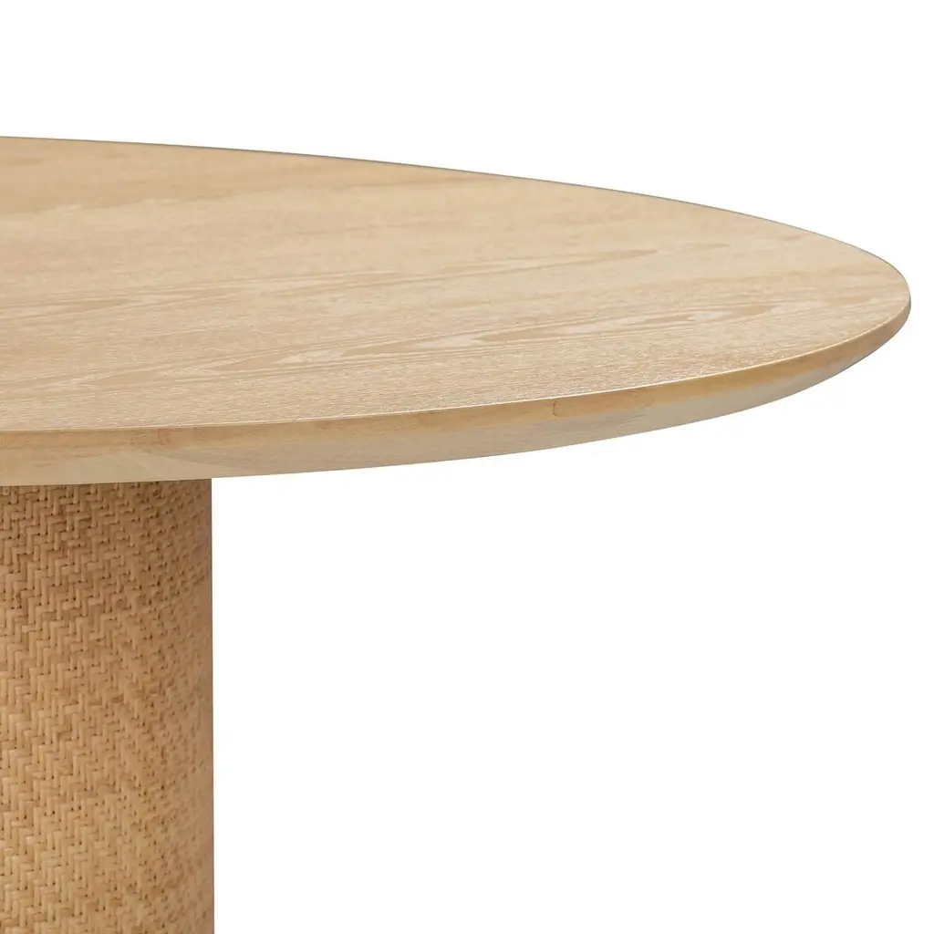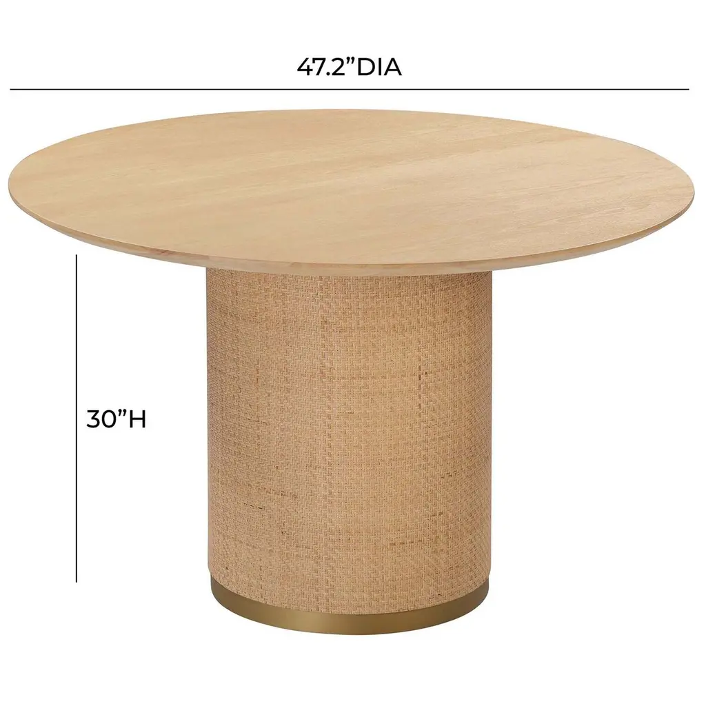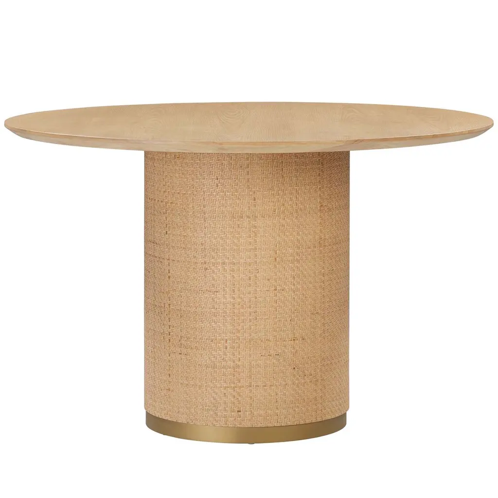 Woven rattan is wrapped around this handcrafted dining table's pedestal base, providing a breezy complement to the brass plinth and the richly figured wood top. A little larger than four feet in diameter, the table seats up to six people.