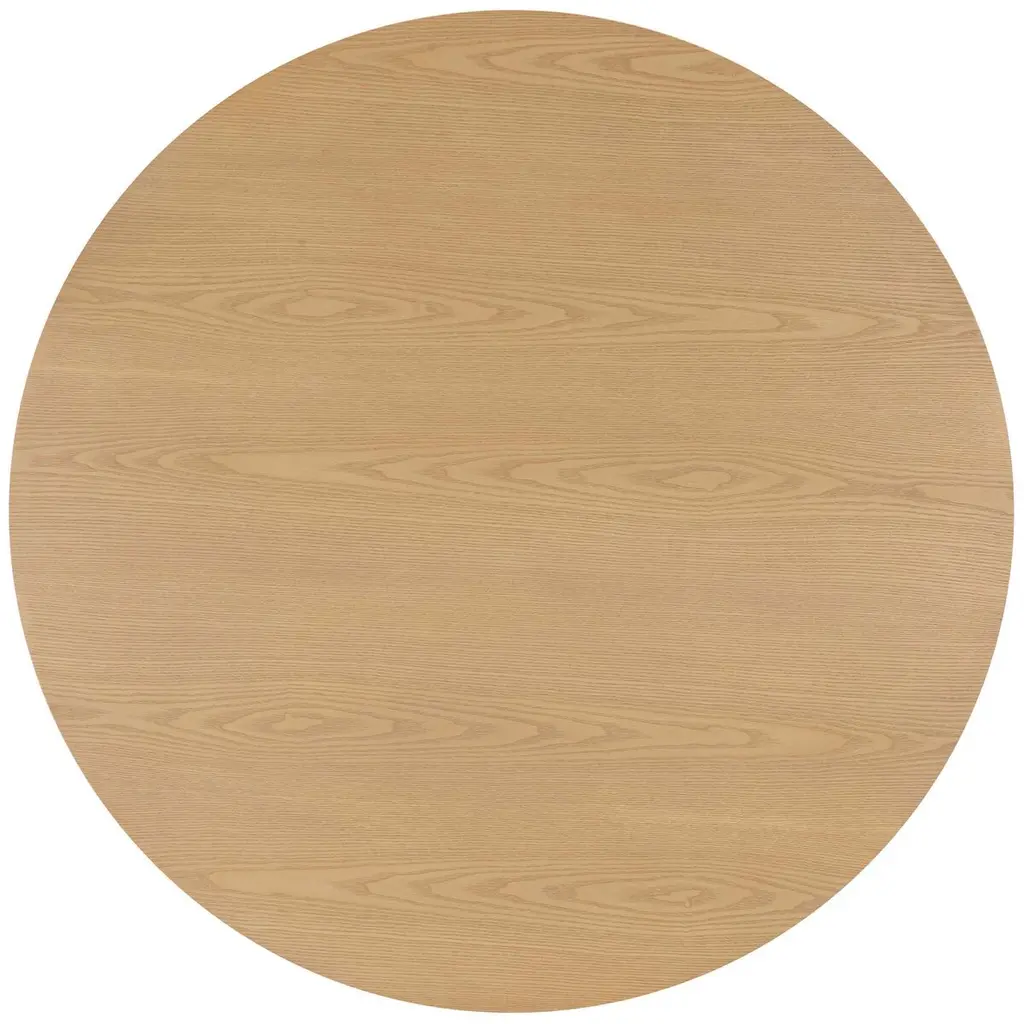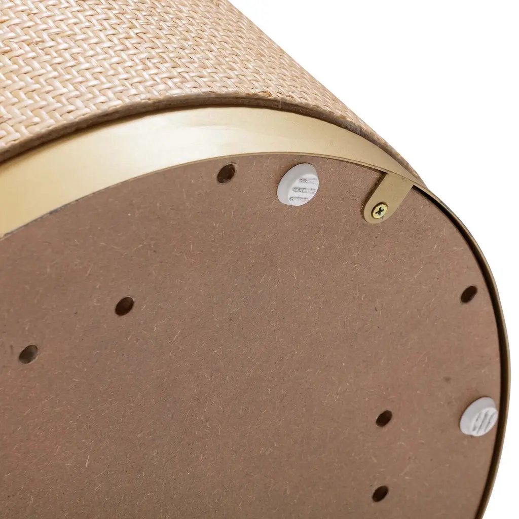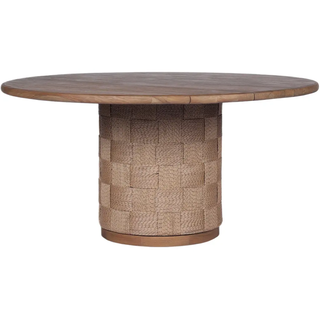 Woven rattan is wrapped around this handcrafted dining table's pedestal base, providing a breezy complement to the brass plinth and the richly figured wood top. A little larger than four feet in diameter, the table seats up to six people.