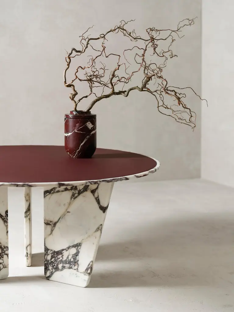 Queen Dining Table by Kreoo Designed by Christophe PilletDimensions: Ø 160 x H 71 cm.Materials: Calacatta Viola marble.Available in different marble options. Please contact us.The elegance and simplicity of design meet material richness in the Queen table, designed by Christophe Pillet for Kreoo. The base, in Calacatta Viola marble, is formed by three trapezoidal-shaped sections with chamfered corners; even their edges are radiused and soft to enhance the veins of the natural stone, while the matt finish creates an almost velvety effect on the surface. Circular and available with a diameter of 160 cm, the top can be entirely selected in marble or, alternatively, create a contrast with the insertion of leather. The latter enhances it with its precious covering of the same hue as the speckles of Calacatta Viola, and on the edge, a raised stitching reveals an additional detail of artisanal craftsmanship. Queen is designed to be used as a meeting table or as a precious and unique furnishing for residential, retail, or hospitality environments.Kreoo: the new marble experienceKreoo links its name to the best Italian tradition in marble manufacturing and brings to new light the primordial charm of a material that has witnessed the evolution of civilizations and cultures.From the bathroom and living room to coverings, home accessories, and lamps, the company works with natural stone in various forms and aesthetic compositions, enriching it with other materials such as metals, wood, and glass. The result is a fascinating and chromatic language, suitable both indoors and outdoors. Expressed in contemporary but still customizable designs, Kreoo highlights workmanship know-how and excellence.The brand, born in 2010 by the experience of Decormarmi and its worldwide distribution strength, has led to major international projects, especially in hospitality and luxury residential.