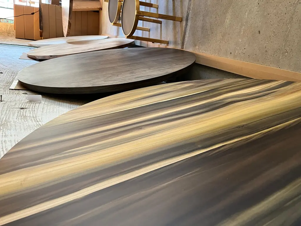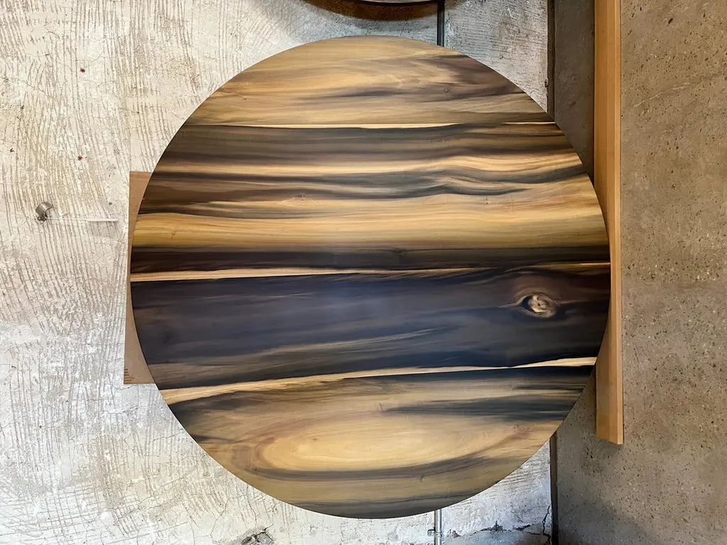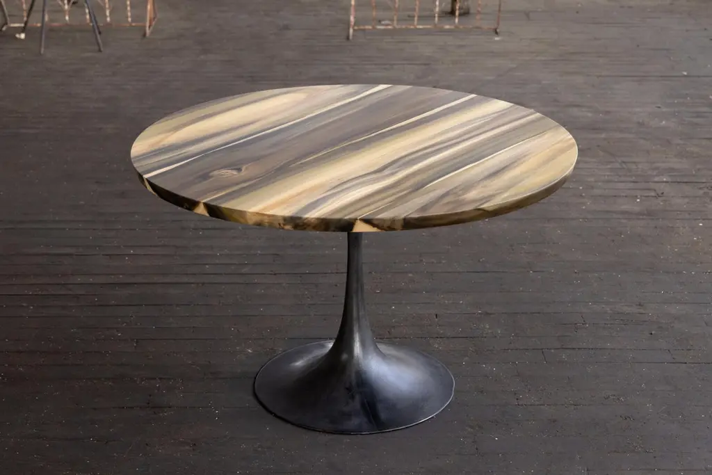 The Amicalola base captures the room set against a round or oval table top. This pedestal base is hand cast by the artisans at Sloss Furnaces historic foundry in Birmingham to look beautiful and function out of the way of diner's feet. Rich with Mid-Century Modern inspiration, we conceived the name while hiking the 600 steel stairs that scale the face of Amicalola Falls, the gateway to the Appalachian Trail. Solid walnut wood is finished with a durable, low-sheen urethane finish. A study in modern style and simplicity, the silhouette of the black patina base contrasts with the exuberant grain of each wide plank of solid rainbow poplar wood. Place this round table in a dining room, kitchen or entry hall. Urban wood means your furniture is better for the environment. Expert, American craftsmanship means it's tomorrow's heirloom.Urban wood has character. Character can include variations in color and grain, small pin knots, evidence of historical intrusion. There may be cracks or knots that we fill, patch or join in a considered and artful way at the makers discretion. We look at every slab and decide what needs a patch or epoxy or both. Case by case, one may be more effective and better for the furniture, aesthetically, structurally, and for our process. If a specific tool, like a patch, is not desired, please specify this when ordering. This may require procuring different lumber which can alter costs.