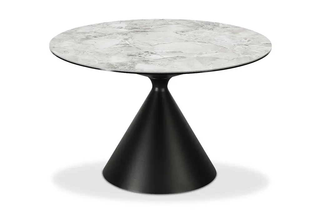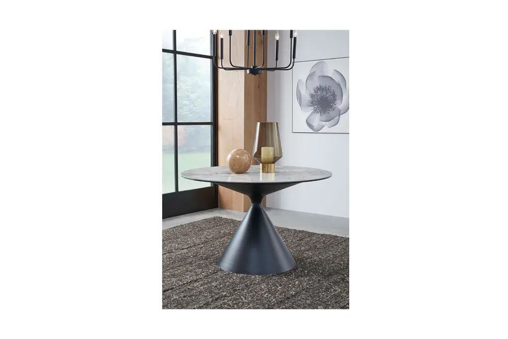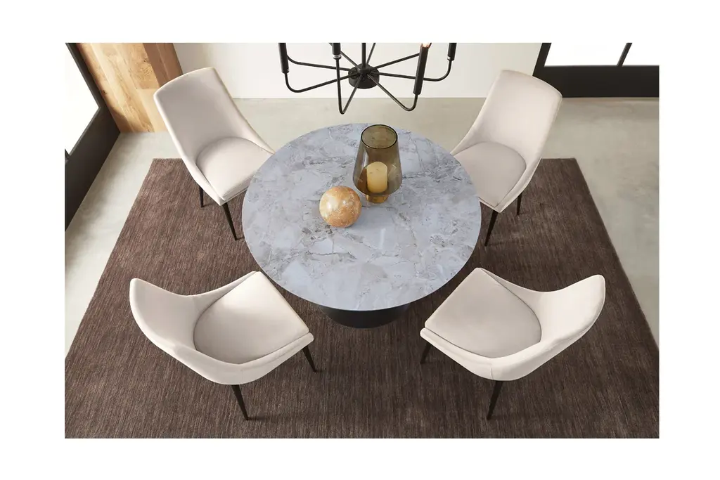 With its sleek stone top and sculptural pedestal base hand-welded and polished, the Ralston Round Dining Table cuts a dramatic figure in any dining room. This table showcases unmatched durability and resistance to scratches and heat, crafted from sintered stone and steel, and features a stone top bonded to a layer of clear glass for added strength. It comfortably seats up to four people and pairs well with matching Ralston Dining Chairs.