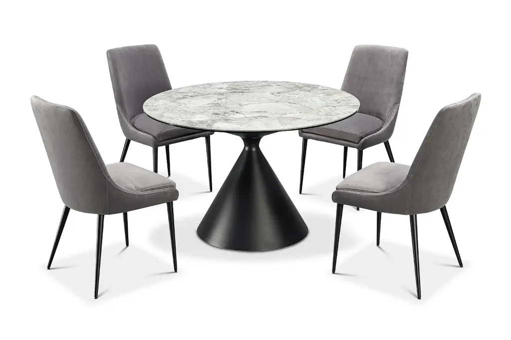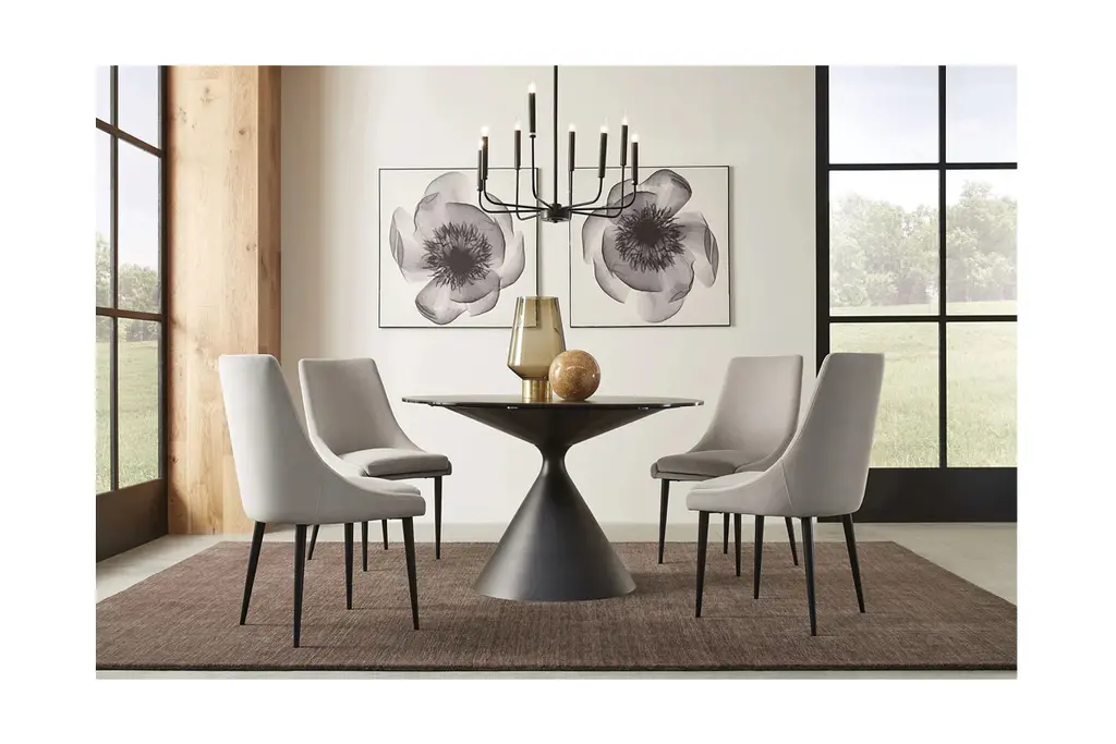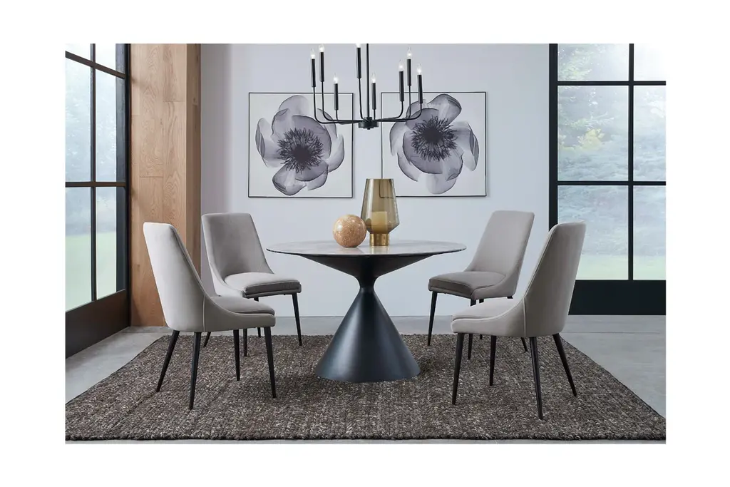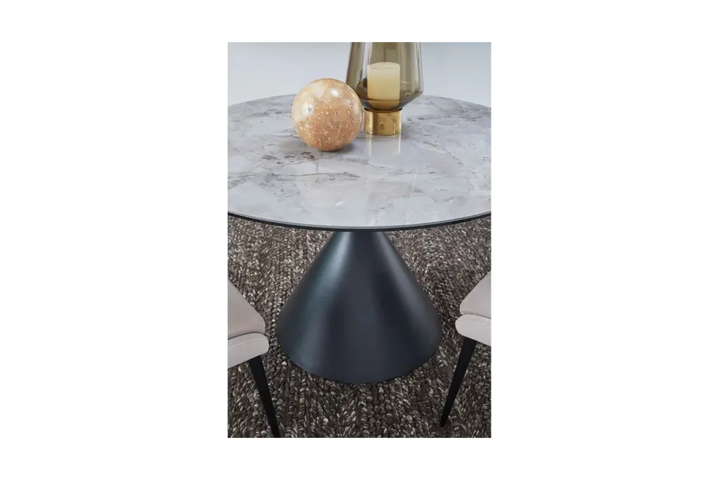 With its sleek stone top and sculptural pedestal base hand-welded and polished, the Ralston Round Dining Table cuts a dramatic figure in any dining room. This table showcases unmatched durability and resistance to scratches and heat, crafted from sintered stone and steel, and features a stone top bonded to a layer of clear glass for added strength. It comfortably seats up to four people and pairs well with matching Ralston Dining Chairs.