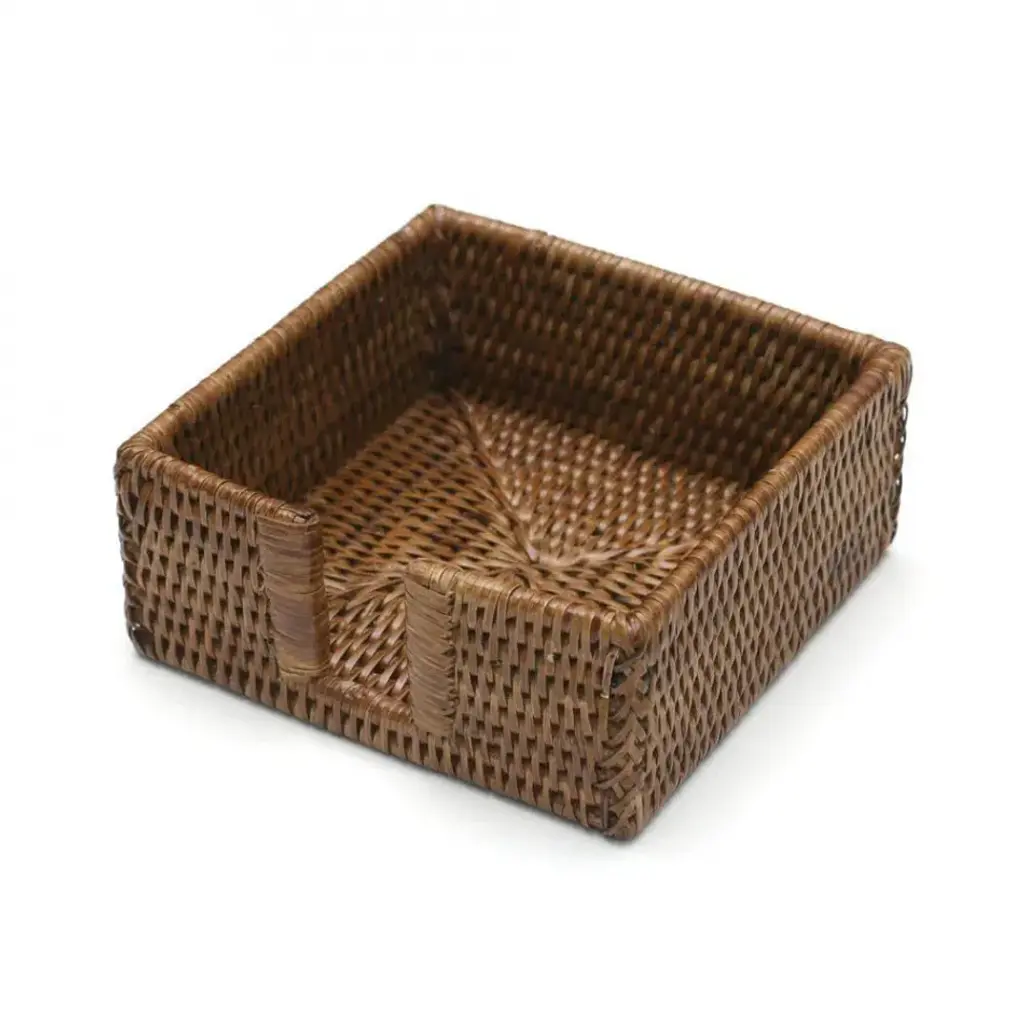 Perfectly sized to hold Caspari paper and paper linen napkins, our napkin holders are an easy addition to your tabletop décor. They are a perfect way to keep napkins neatly presented in your dining room, on your coffee table, kitchen counter, or in a guest bath. The designs in our rattan collection feature a durable double-weave and handcrafted charm. Constructed from naturally fast-growing rattan, these reusable pieces add an element of eco-friendly style to your tabletop. Each napkin holder can hold up to 2 packs of Caspari napkins and coordinate well with most of our existing designs and colors.