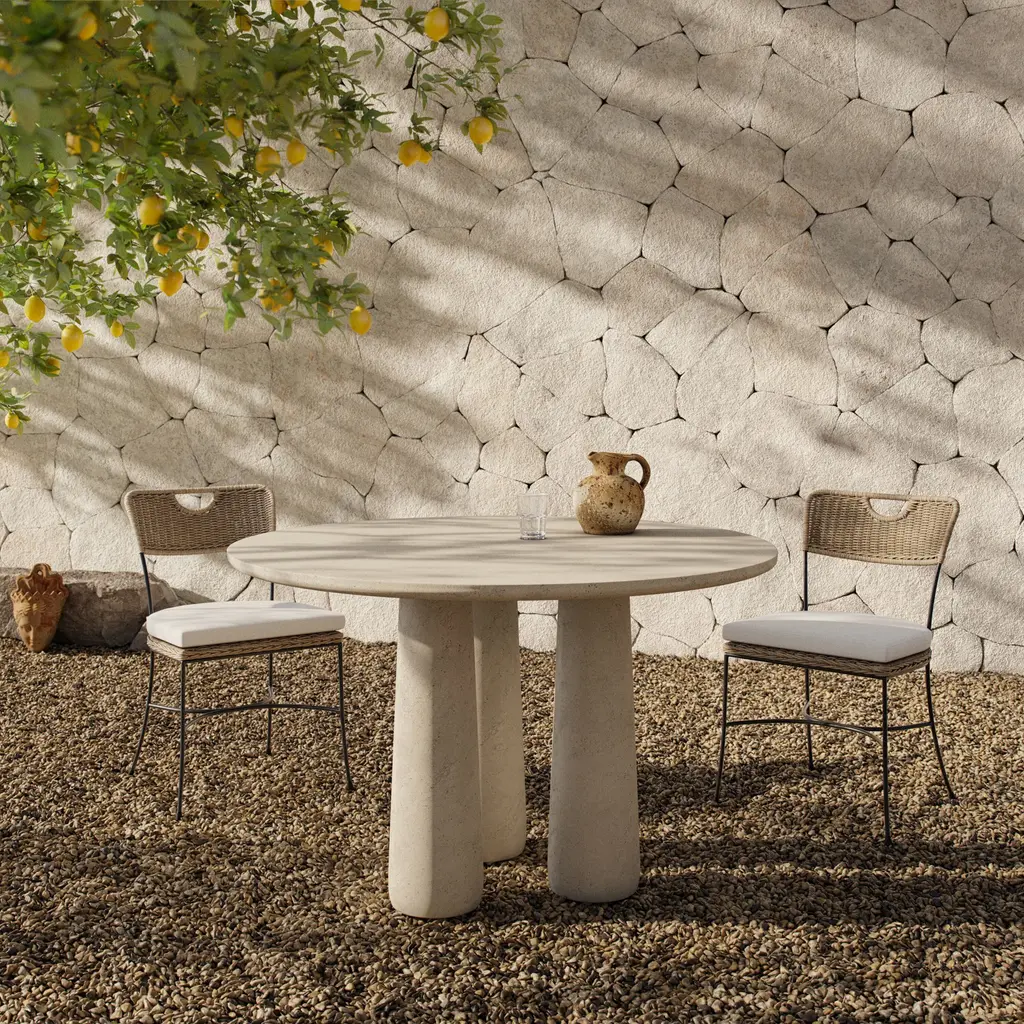 The Ravienne Outdoor Dining Table is a masterful play in proportion, where simple shaping highlights the exquisite texture of cast concrete. Its design features three sturdy pedestal legs that support a bullnose-edge top, creating a striking centerpiece for any outdoor setting. This table is not only a functional piece but also a statement of style and durability. To maintain its beauty, it is recommended to cover or store the table indoors when not in use or during inclement weather.