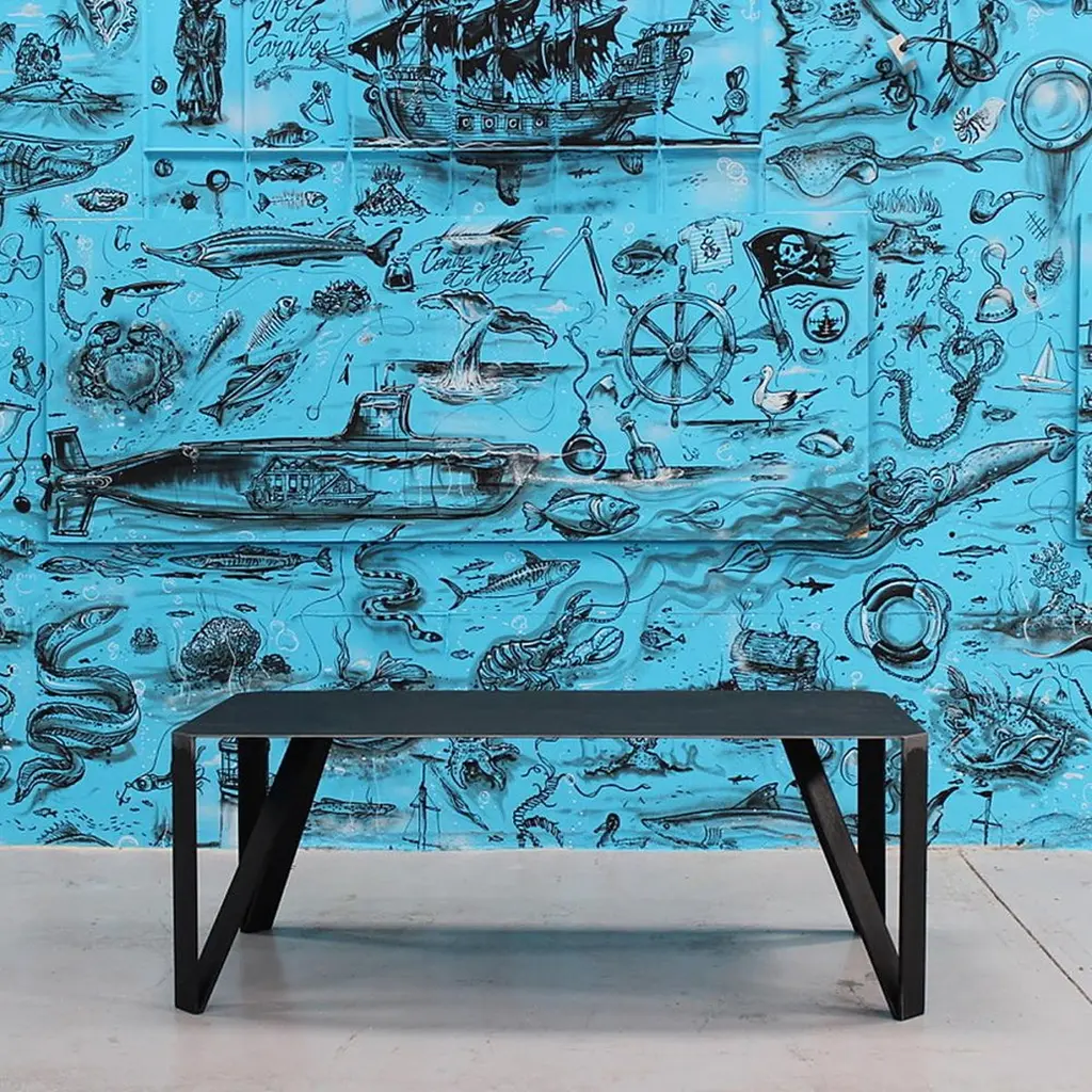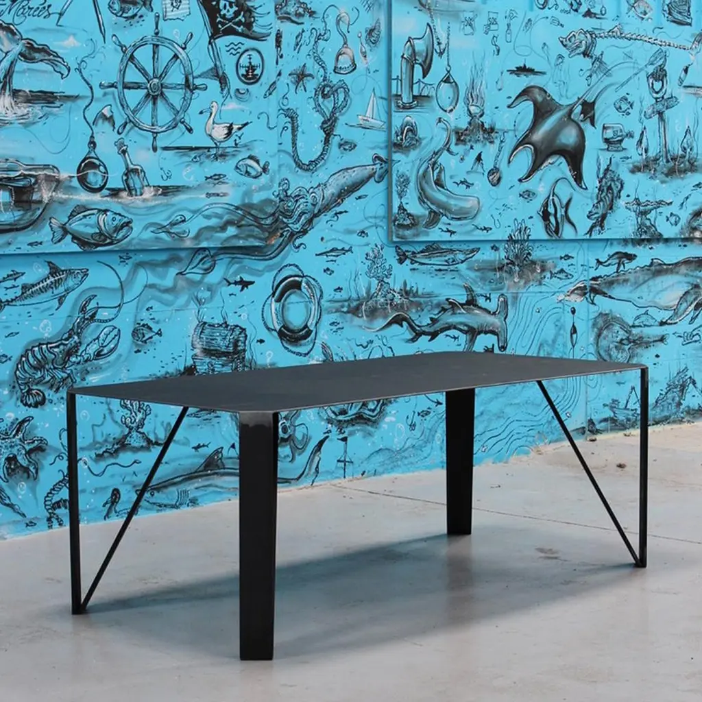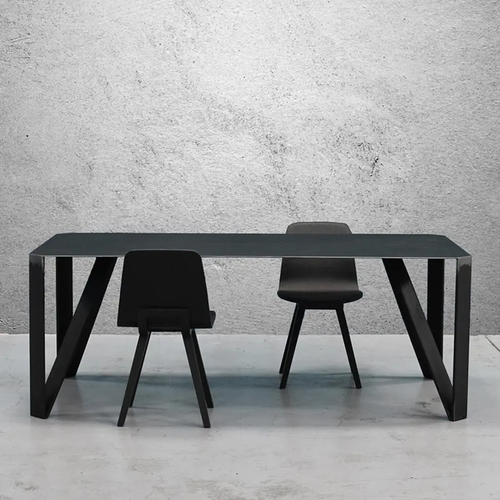 Dining table Raw Angles in handcraftedsteel, in dark finish. French manufactured.Available in:L 250 x D 100 x H75cm, price: 5900,00€L 300 x D100 x H75cm, price: 6900,00€.