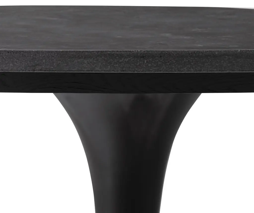 Modern refinement at its best, this midcentury-inspired dining table is crafted of iron with a round bluestone top. Seats four to six guests.