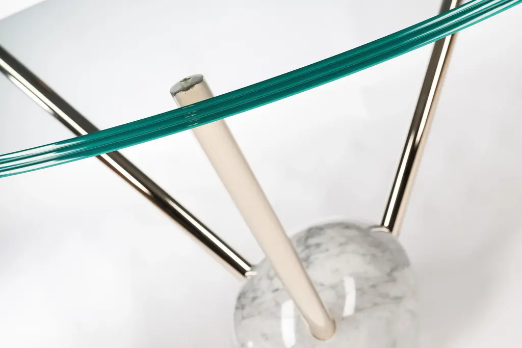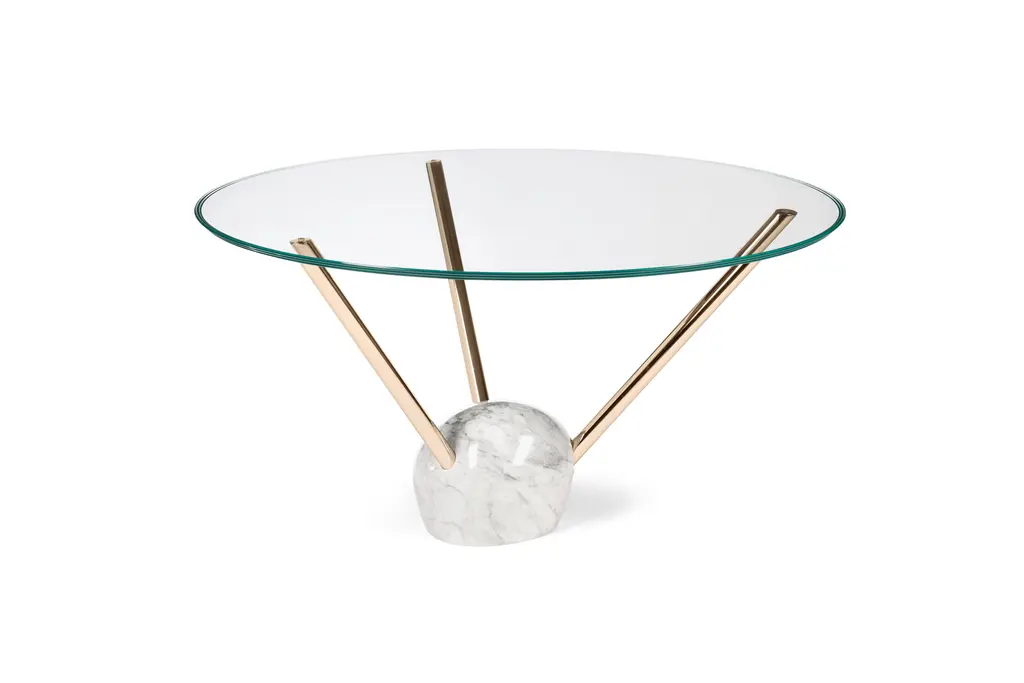 <p>This table is part of VGnewtrend's <em>Unnatural</em>collection. It has a Carrara white marble base, a circular top in beveled glass, and 24K gold stems on the base.</p>