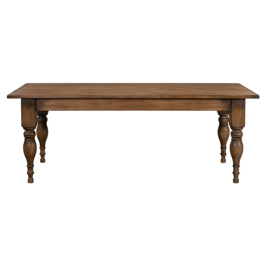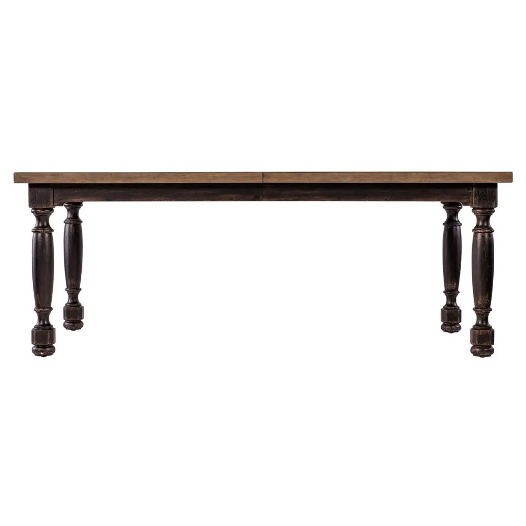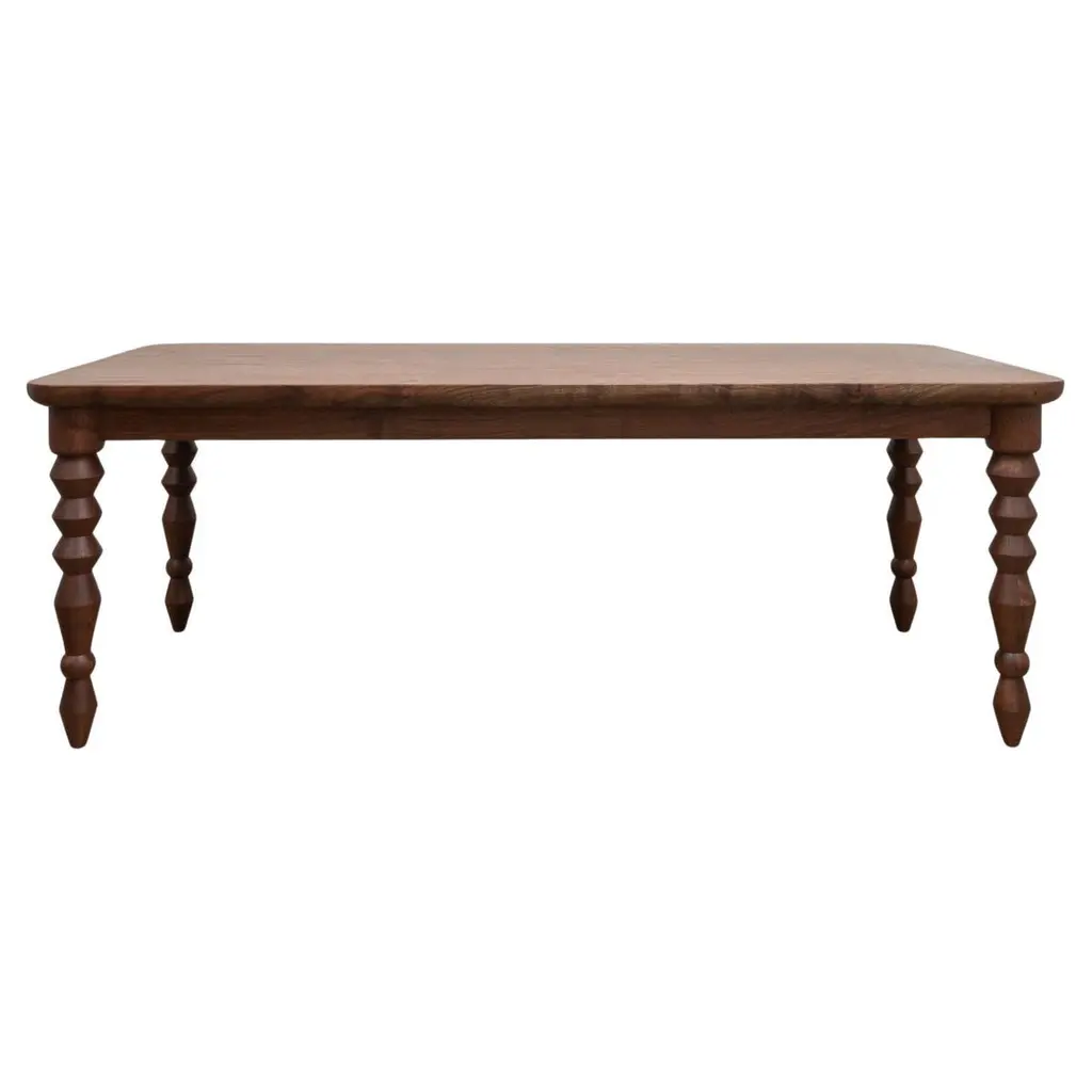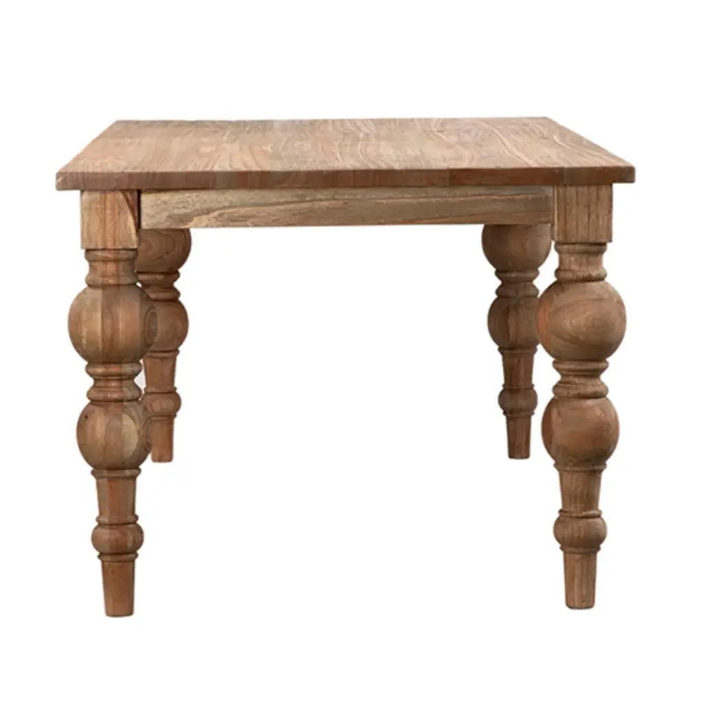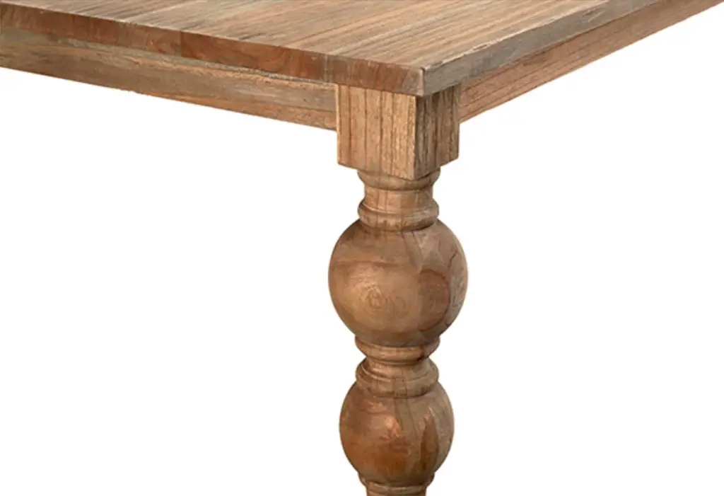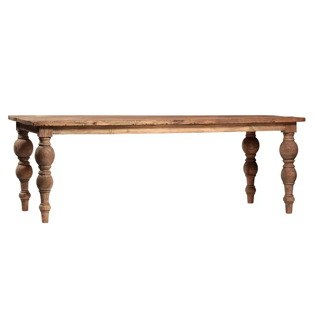 Reclaimed elm wood dining table with carved ball leg design. Each unique in exact wood tones, grain, and natural imperfections. This table weighs approx. 115 lbs.