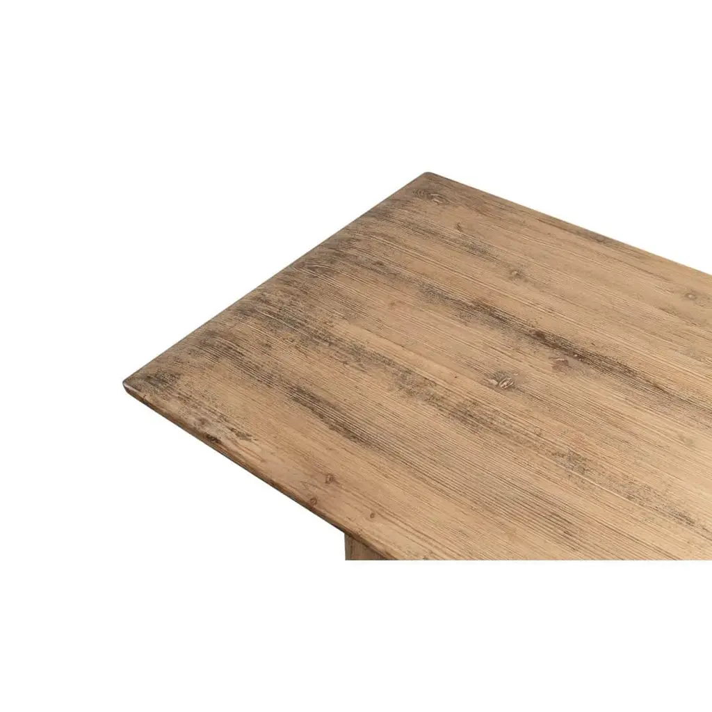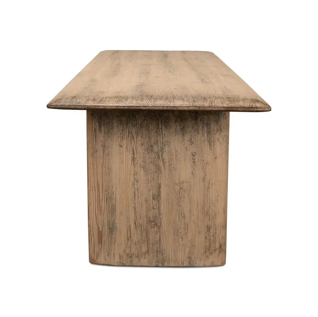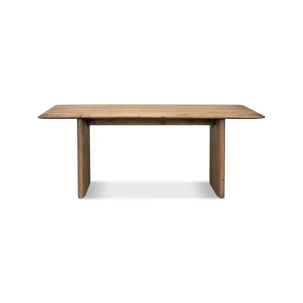 A harmonious blend of simplicity and warmth for your dining space. This table features a natural wood surface of reclaimed pine with a rich grain that tells its unique story. Its minimalist silhouette, characterized by clean lines and a thick, slab-style top, anchors your dining room with a modern edge. The sturdy, gently curved block legs ensure stability while adding to the piece's contemporary charm. This table isn't just a piece of furniture; it's a gathering place for family and friends, a testament to understated elegance, and a celebration of natural beauty that will enhance every meal with its inviting ambiance. Dimensions: 79" W x 31" D x 31" H