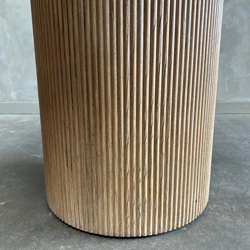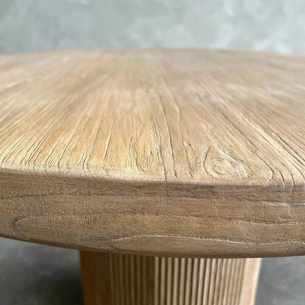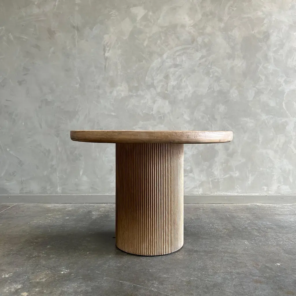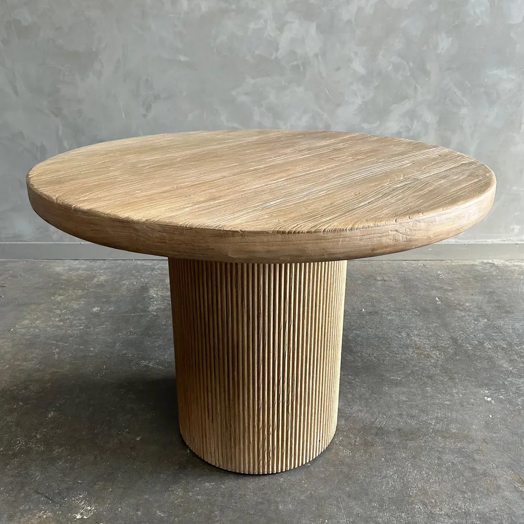 Nori dining table 44” diameter x 30”hWith a fluted column table base, the Nori Dining Table is a modern take on a fluted column base dining table. Made of reclaimed elm, the table’s finish highlights the natural grain and beauty of the wood. The Nori features a smaller fluting, and thick edge tabletop.Due to the handmade construction and natural wood material, variations in color, texture and finish are to be expected and add to the unique character of each piece.48" D x 30"HFinish: WaxCare Instructions : Avoid direct sunlight; avoid exposure to heat; avoid excessive moisture. Use coasters and trivets to protect the surface from wet or hot cups or dishes. Avoid sharp objects. Address spills immediately by wiping with a soft, d