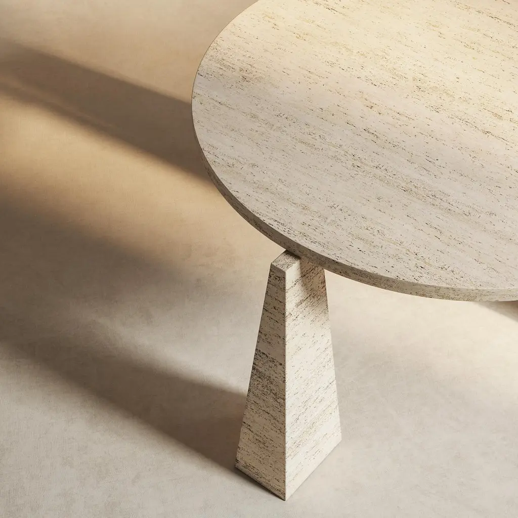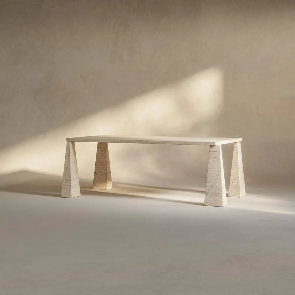 Rectangular Dining Table by dAM AtelierDimensions: D 200 x W 100 x H 74 cmMaterials: Travertine Stone. dAM atelier is a duo of young Italian architects sharing the passion for design and architecture, Paolo d’Alessandro and Marco Malgarini.The studies of architecture in Switzerland, at the Accademia di Architettura di Mendrisio, have been essential to define the way of thinking and to shape their design vision. It also gave the trainee to work at the different scales that each project requires with the same attitude and accuracy.They conceive design as the elaboration of thoughts in a continuous process of adding and subtracting information, seeking a composition of raw elements that are able to generate a moment of wonder. The result is an aesthetic that is minimalistic, pure and timeless but arouses emotions.