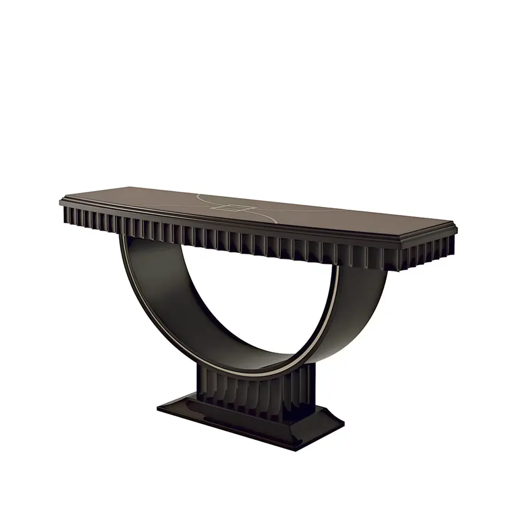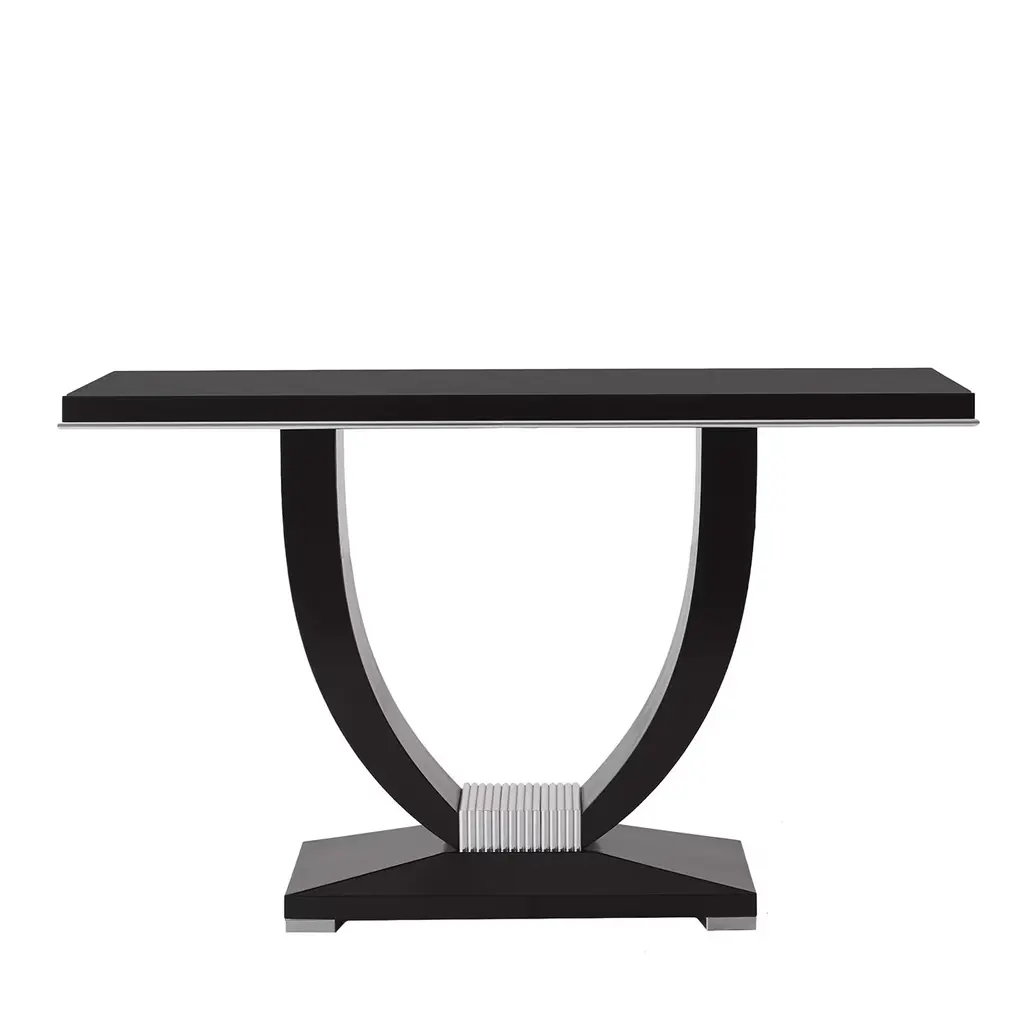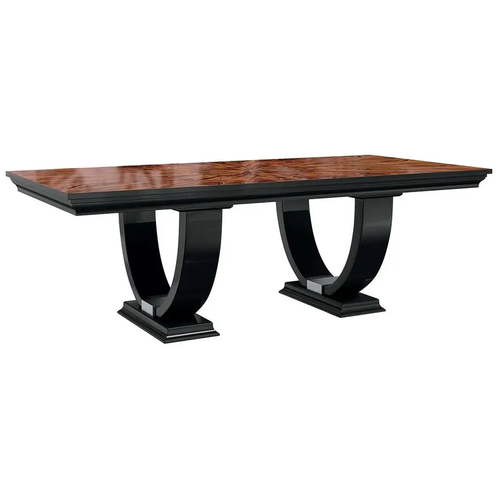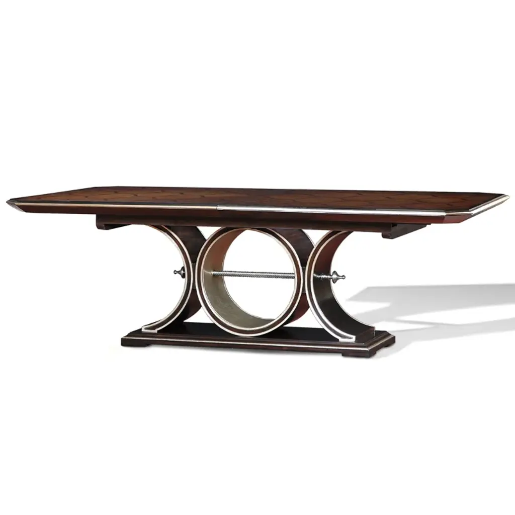 A stately design that will take center stage in a modern-style dining room, this magnificent rectangular table exudes timeless elegance and sophistication. Deftly handcrafted of wood, it combines polished brown and black finishes in a sublime contrast with shiny gold-finished metal details. Please consult the Concierge for further details.