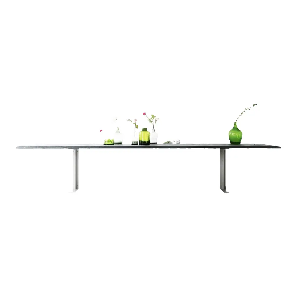 The Rectangular Industrial Dining Table by Lema is designed to furnish a large dining area or sophisticated meeting room, Memo is defined by the contrast between its intentionally oversized volumes and the minimalist discretion synonymous with Piero Lissoni, who has been the art director of Lema since 1995. A piece utterly devoid of ostentation, Memo achieves perfect balance thanks to the symmetry between the table top - available in heat-treated oak or volcanic stone, an exclusive Lema finish created via a meticulous manual process - and the metal structure, with its bold, industrial-inspired design. Much of the aesthetic research behind the piece focused on materials and their expressive capacity, with care taken to avoid any gimmicks. Ultimately, at the heart of Memo is a coherent creative style whose strength is its simplicity.